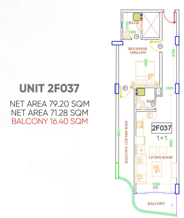 Apartmán má prostornou ložnici se svým vstupem na balkon. Obývací pokoj je spojen s kuchyni a též disponuje balkonem s panoramatickými výhledy na ománské pobřeží a okolní krajinu. Jednotka je zpracovaná ve vysokém technickém standardu a s designovými prvky ve východním stylu. Jednotka je plně vybavená kvalitním nábytkem. Klimatizace je zde samozřejmostí.