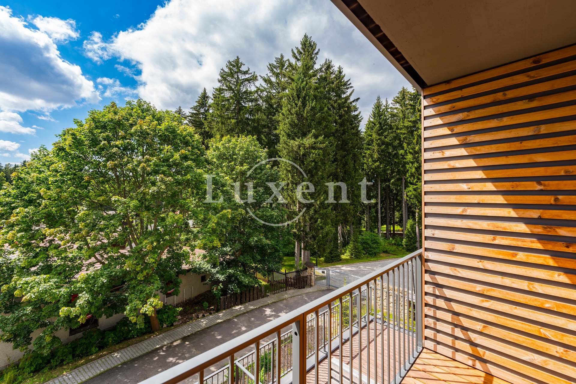 Nabízíme apartmán o dispozici 1+kk v 2.NP luxusního projektu HARRACHOV PEAKS. Apartmán má obytnou plochu 52,17 m² a celkovou užitnou plochu 56,68 m² vč. balkonu (4,51 m²). Pomocí připraveného individuálního architektonického návrhu vestavby je možné získat originální dispozici blížící se 2+kk (viz vizualizace ve dvou variantách). Projekt je dokončen a zkolaudován a vzorový byt je otevřen k prohlídkám a ukazuje možné dispoziční řešení i pro tento apartmán. V suterénu projektu je majitelům apartmánů k dispozici wellness se saunou a vířivkou a vybavené fitness.