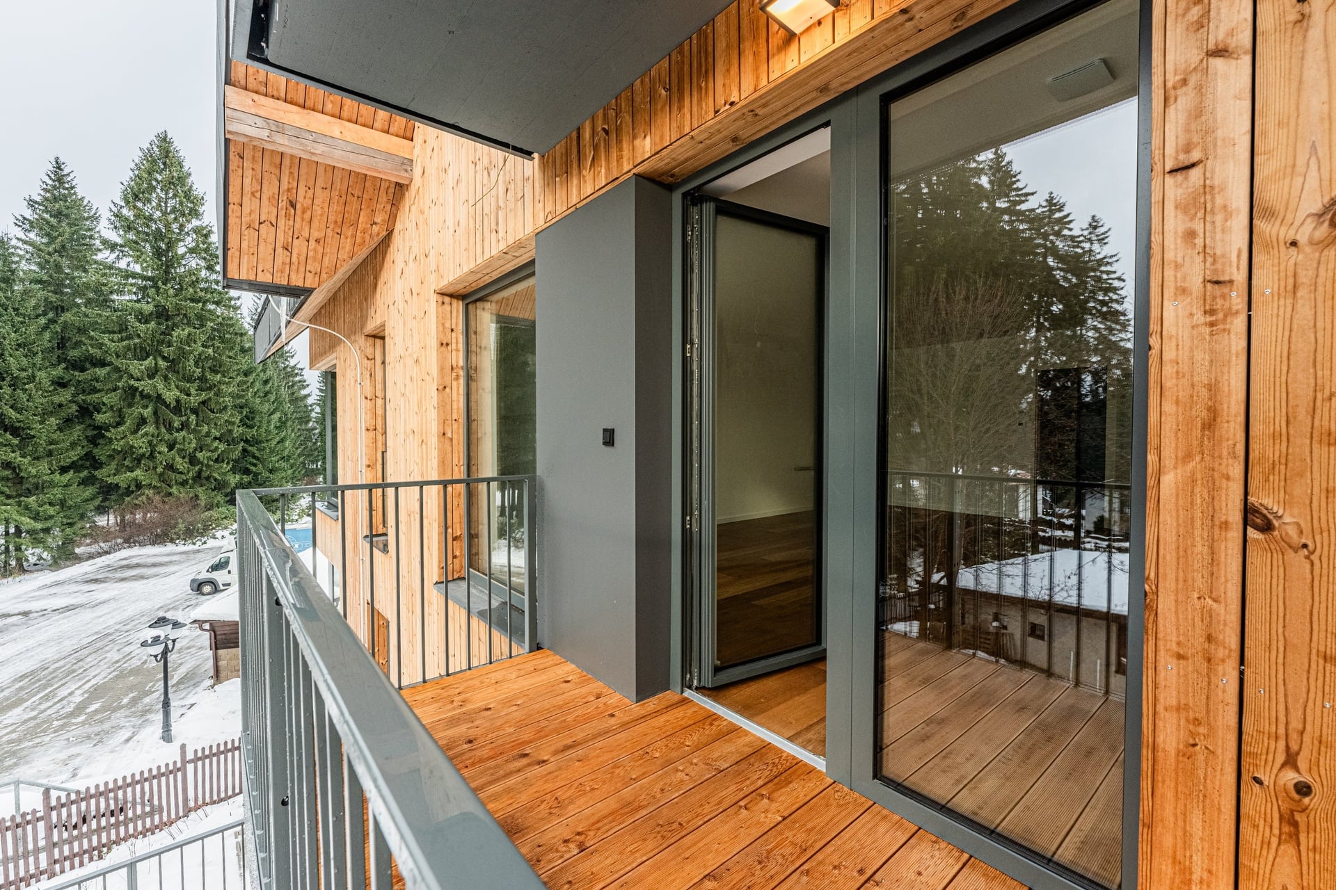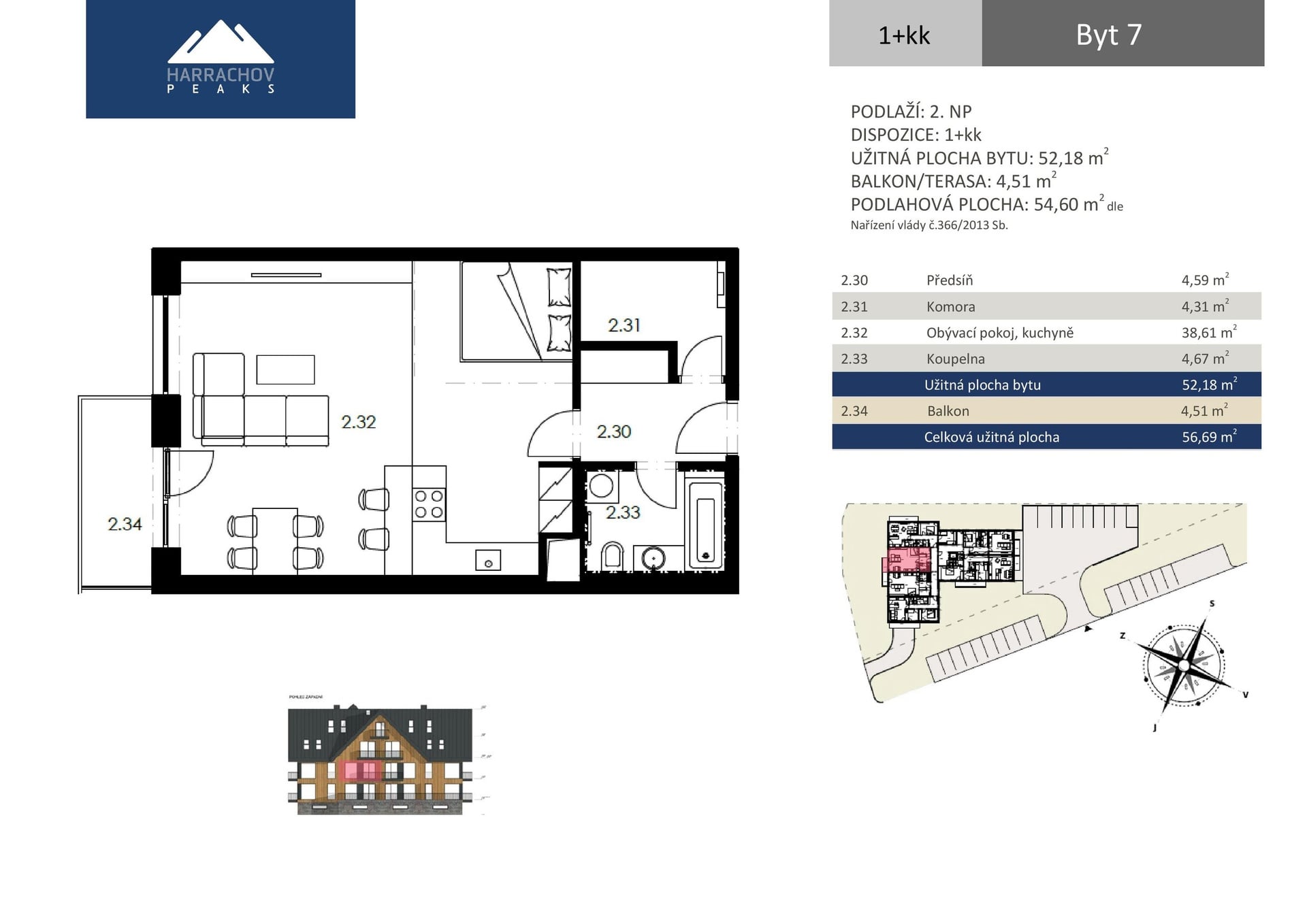Nabízíme k prodeji apartmán o dispozici 1+kk, obytné ploše 52,2 m² a podlahové ploše 54,6 m² s balkonem 4,5 m², který se nachází ve 2. nadzemním podlaží nově vznikajícího projektu HARRACHOV PEAKS. V komorním projektu je k dispozici celkem 16 stylových, útulných apartmánů o velikostech od 1+kk až po mezonety 4+kk s výhledem na vrcholky okolních hor, každý s terasou nebo balkonem. Tento nový apartmánový dům se nachází na horách přímo v lyžařském a rekreačním středisku – v oblíbené krkonošské lokalitě města Harrachov.