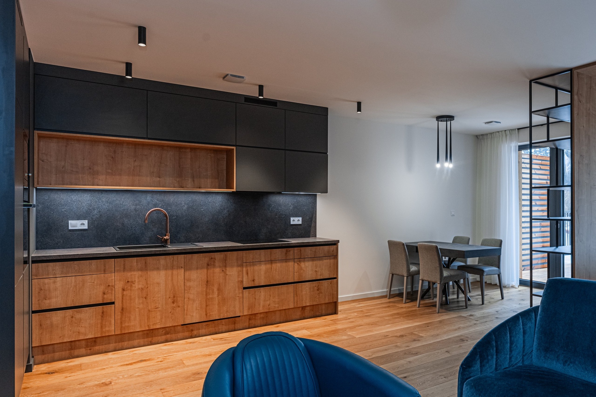 Nabízíme apartmán o dispozici 1-2+kk v 1.NP luxusního projektu HARRACHOV PEAKS. Apartmán má obytnou plochu 52,19 m² a celkovou užitnou plochu 80,16 m² vč. terasy (27,61 m²). V prostoru tohoto apartmánu získáte snadno pomocí připraveného individuálního architektonického návrhu vestavby originální dispozici blížící se 2+kk (viz vizualizace). Terasa apartmánu je vůči zemi vyvýšená a odpovídá 2. NP. Vybavený vzorový byt projektu má stejnou dispozici, takže je možné se inspirovat. Je zařízen kuchyní (spotřebiče BEKO) a skříňová vestavba odděluje spací a jídelní kout a apartmán se tak přibližuje dispozici 2+kk.