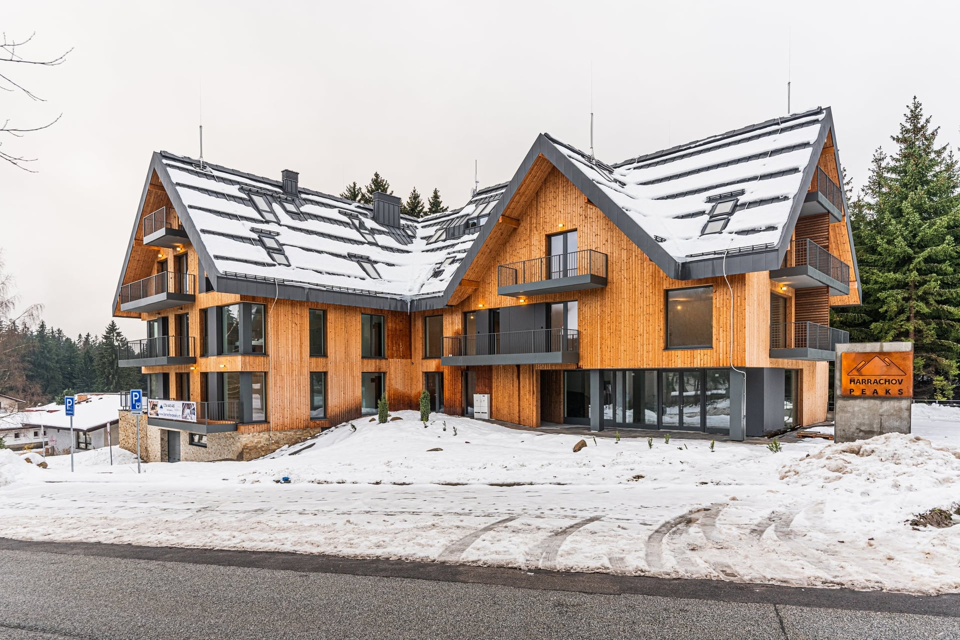 Harrachov Peaks je luxusní projekt vystavěný z kvalitních přírodních materiálů s wellness se saunou a vířivkou a plně vybaveným fitness. Představuje pouze 16 moderních apartmánů a nabízí tak komorní atmosféru v domě pro jejich majitele. Svým konceptem uspokojí zájemce jako o druhé bydlení v Krkonoších, tak investory se záměrem zajistit své finance nebo praktikovat výnosové krátkodobé pronájmy. Součástí nabídky je i správa apartmánů včetně pronájmů. Projekt HARRACHOV PEAKS nabízí vysoký standard vybavení – dubové podlahy, dřevěné terasy, velkoformátové obklady v koupelnách a na chodbách a další. Vytápění probíhá tepelnými čerpadly a je rozvedeno podlahovým topným systémem. V bytě je rekuperace. Energetická třída je velmi úspornou B. Kolaudace úspěšně proběhla a nastěhování je možné ihned.