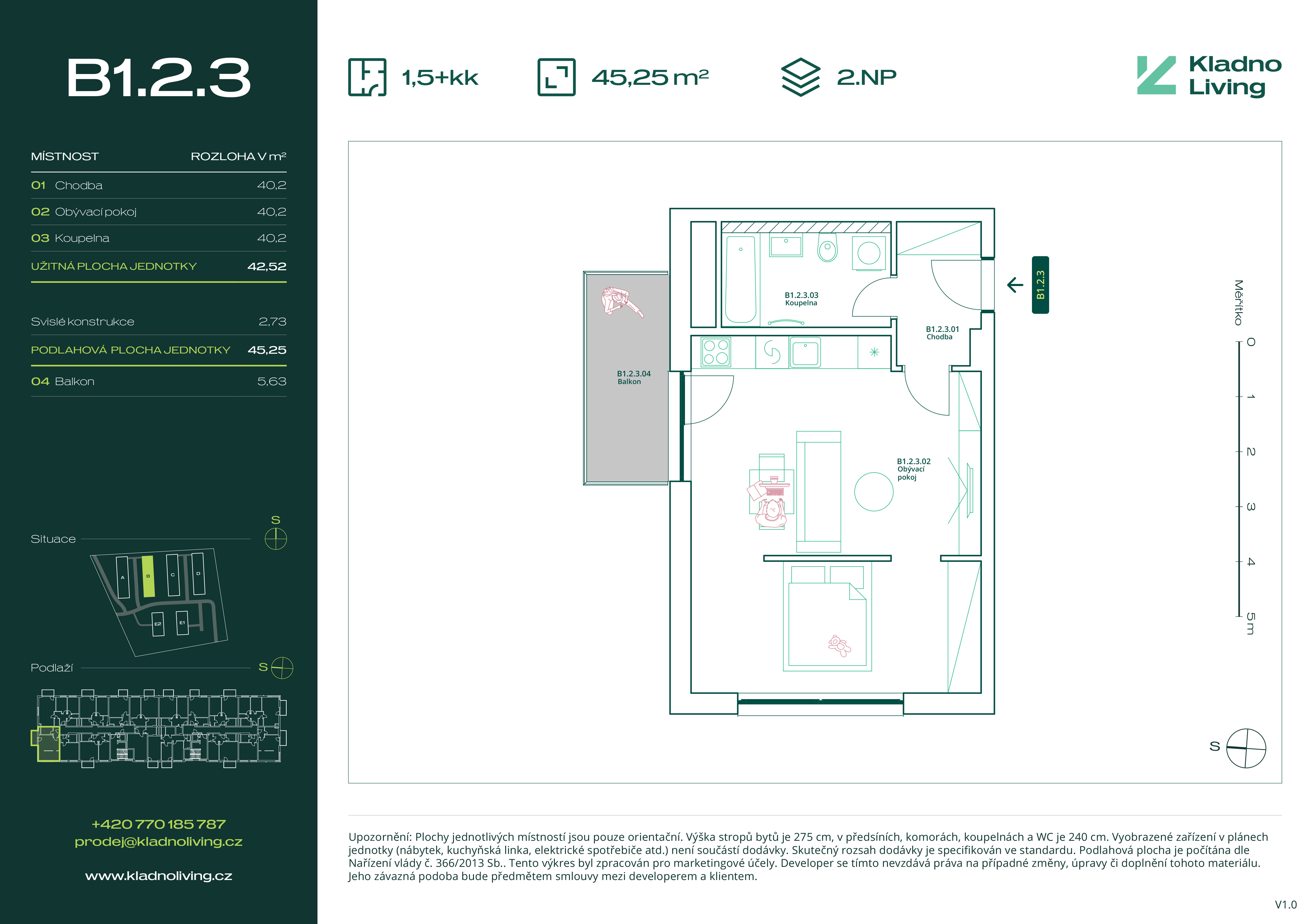 Nabízíme ke koupi moderní byt 1+kk (1,5+kk) o podlahové ploše 45,3 m² s balkonem 5,6 m² v rezidenčním projektu Kladno Living, který vzniká v jedné z nejatraktivnějších lokalit města Kladno – Kročehlavy. Tento nový developerský projekt představuje jedinečnou příležitost pro ty, kteří hledají nové byty v Kladně nebo investici do nemovitosti s vysokým potenciálem zhodnocení.