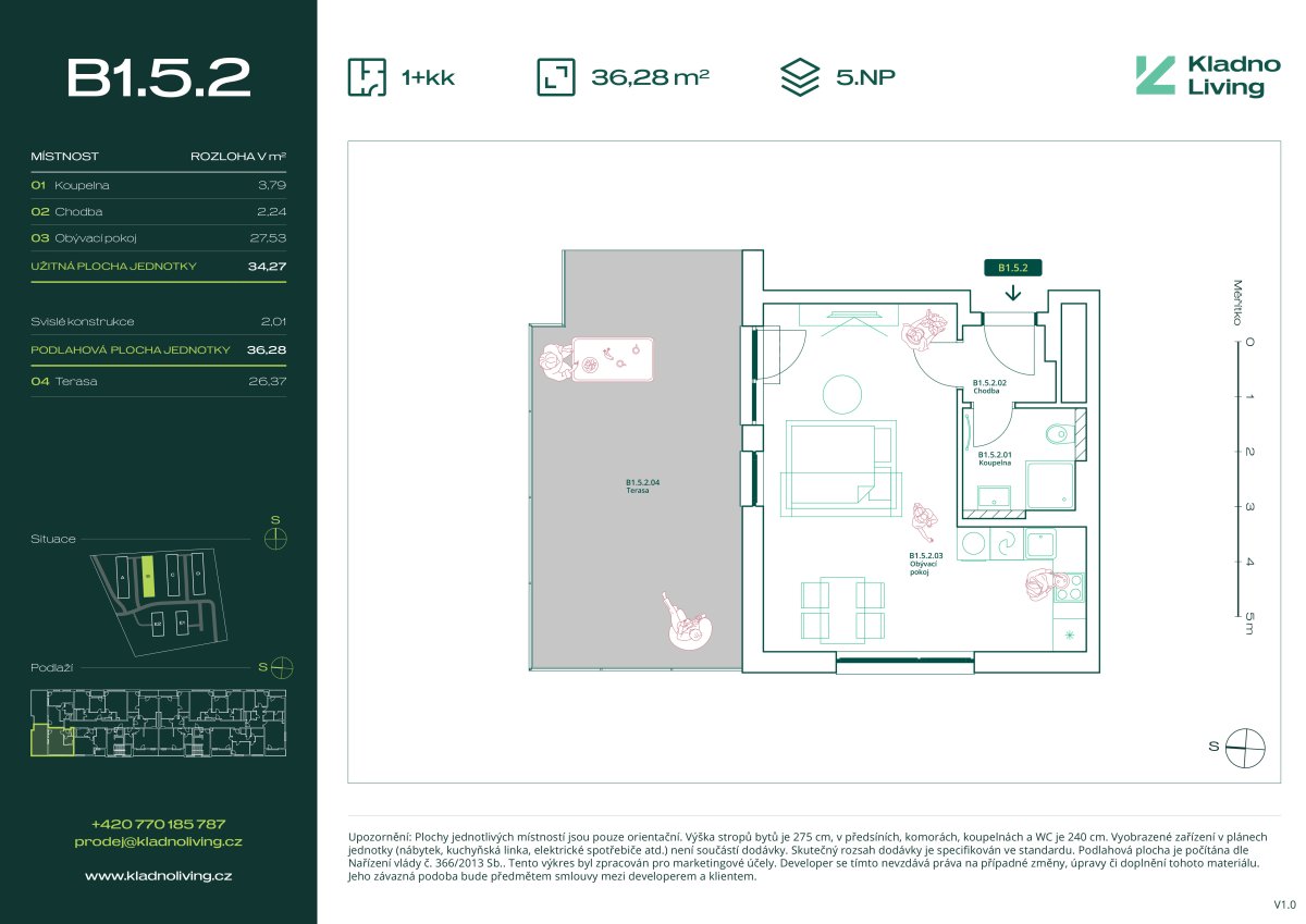 Nabízíme ke koupi moderní byt 1+kk o podlahové ploše 36 m² s terasou 26 m2 v rezidenčním projektu Kladno Living, který vzniká v jedné z nejatraktivnějších lokalit města Kladno – Kročehlavy. Tento nový developerský projekt představuje jedinečnou příležitost pro ty, kteří hledají nové byty v Kladně nebo investici do nemovitosti s vysokým potenciálem zhodnocení.