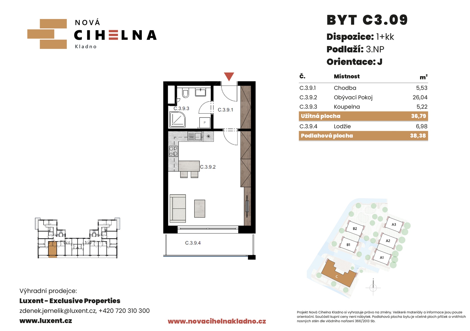 Nabízíme k prodeji byt 1+kk o podlahové ploše 38,38 m² s lodžií 6,98 m² v mimořádně úsporném developerském projektu Nová Cihelna Kladno vznikajícím v městské čtvrti Kladno – Rozdělov.