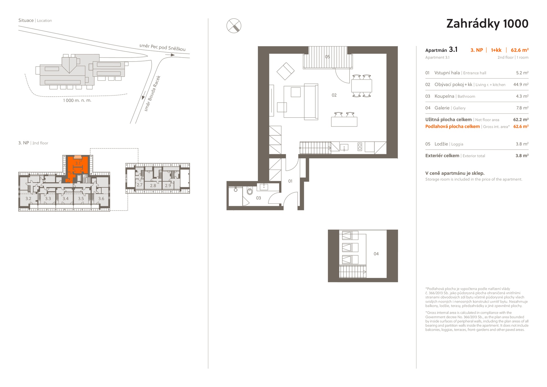 Nabízený apartmán má dispozici 1+kk s lodžií a galerií o celkové ploše 62,2 m2 s lodžií 3,8 m2. Nabízí obývací pokoj s kuchyní a prostupem na lodžii (JV), koupelnu se sprchou a toaletou a v patře galerii (7,8 m2). Orientace oken je na J a JV. K apartmánu náleží sklep.