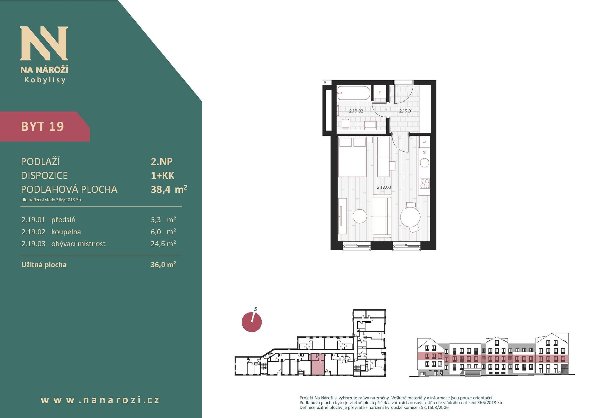 Tento byt 1+kk vznikne v projektu Na Nároží v pražských Kobylisích ve 2.NP moderního bytového domu v pěší dostupnosti metra. Podlahová plocha bytu je 38,4 m², celková plocha bytu činí 36 m². K bytu náleží sklep, který je započten v ceně.