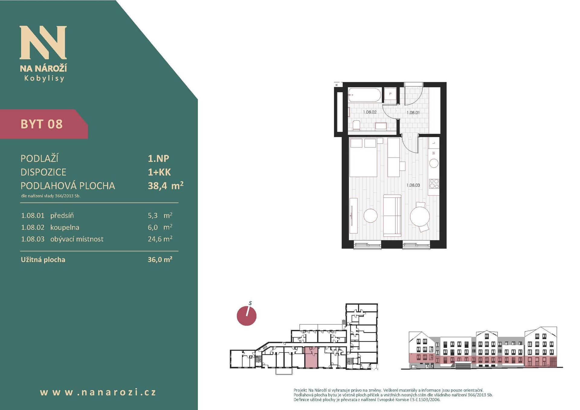 Tento byt 1+kk vznikne v projektu Na Nároží v pražských Kobylisích v 1.NP moderního bytového domu v pěší dostupnosti metra. Podlahová plocha bytu je 38,4 m², celková plocha bytu činí 36 m². K bytu náleží sklep, který je započten v ceně.