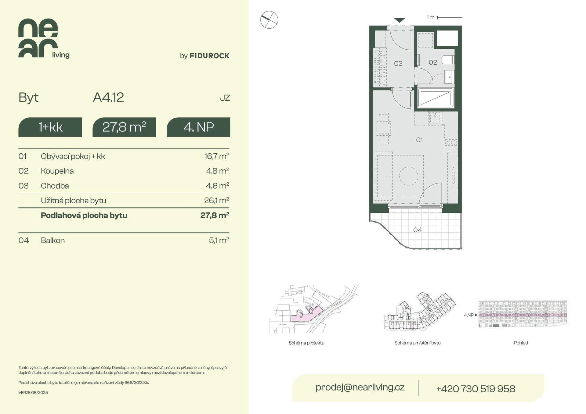 Nabízíme k prodeji byt 1+kk o podlahové ploše 27,8 m² s balkonem 5,1 m² v developerském projektu NEAR living v Praze 8, vznikajícím na pomezí Palmovky a Karlína.