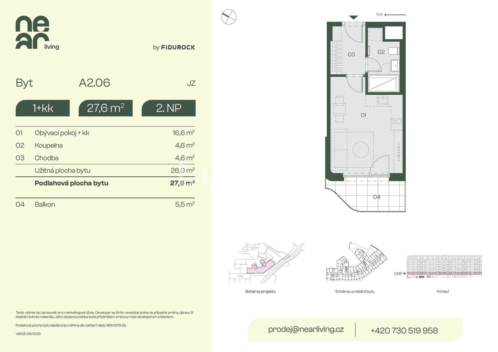 Nabízíme k prodeji byt 1+kk o podlahové ploše 27,6 m² s balkonem 5,5 m² v developerském projektu NEAR living v Praze 8, vznikajícím na pomezí Palmovky a Karlína.