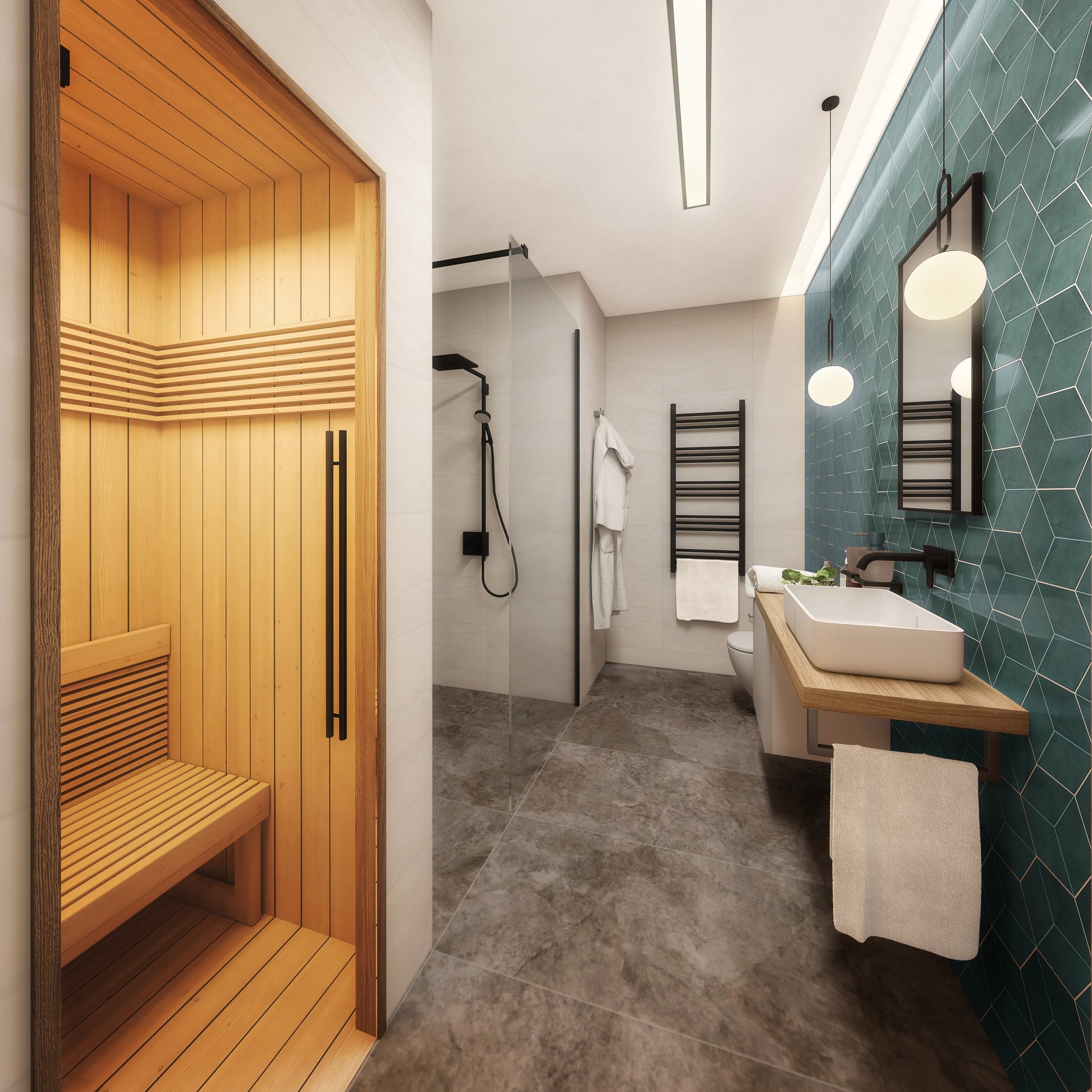 Součástí bytového komplexu je i fitness a wellness s vířivkou a saunou.