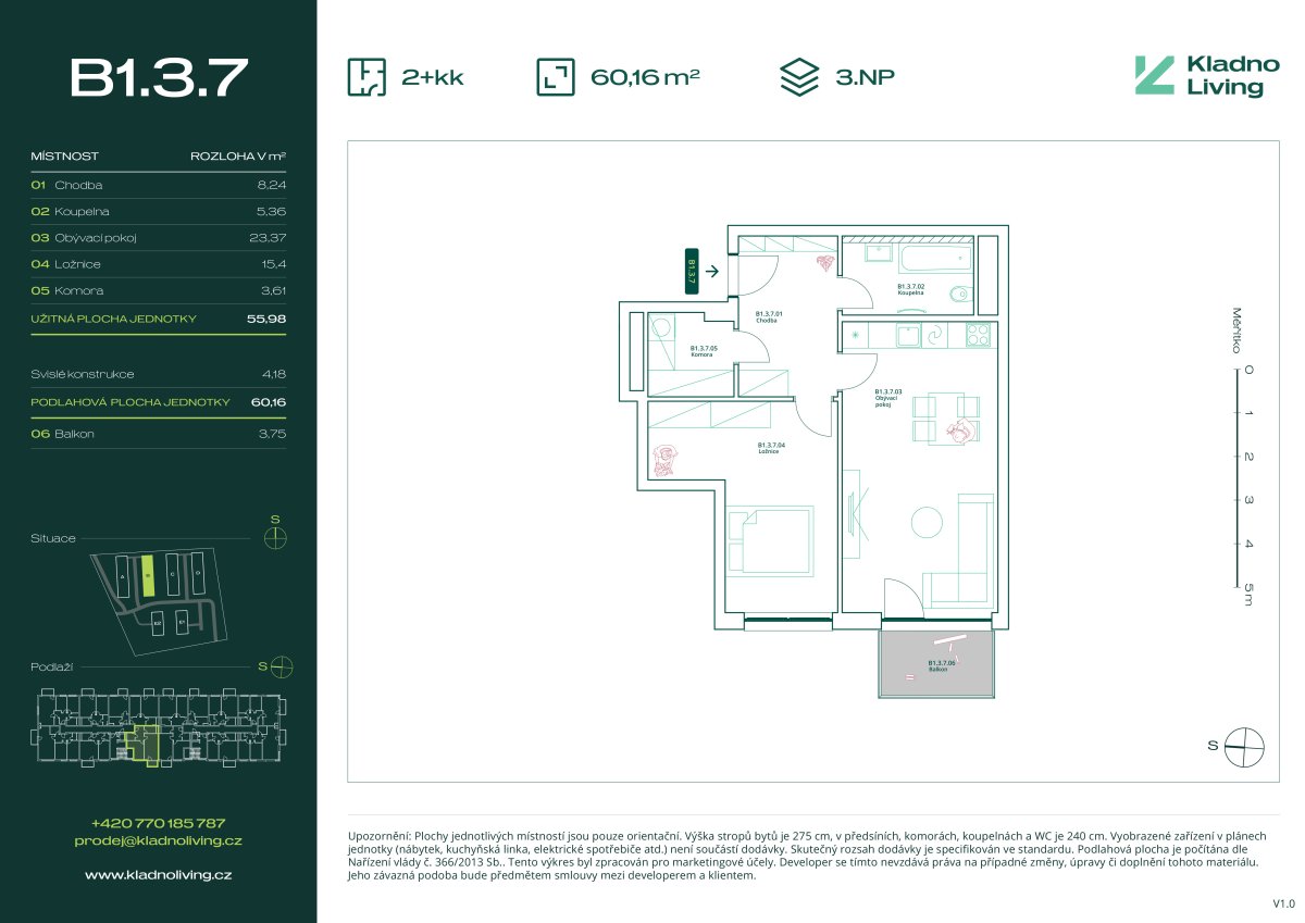 Nabízíme ke koupi moderní byt 2+kk o podlahové ploše 60,2 m² s balkonem 3,8 m² v rezidenčním projektu Kladno Living, který vzniká v jedné z nejatraktivnějších lokalit města Kladno – Kročehlavy. Tento nový developerský projekt představuje jedinečnou příležitost pro ty, kteří hledají nové byty v Kladně nebo investici do nemovitosti s vysokým potenciálem zhodnocení.