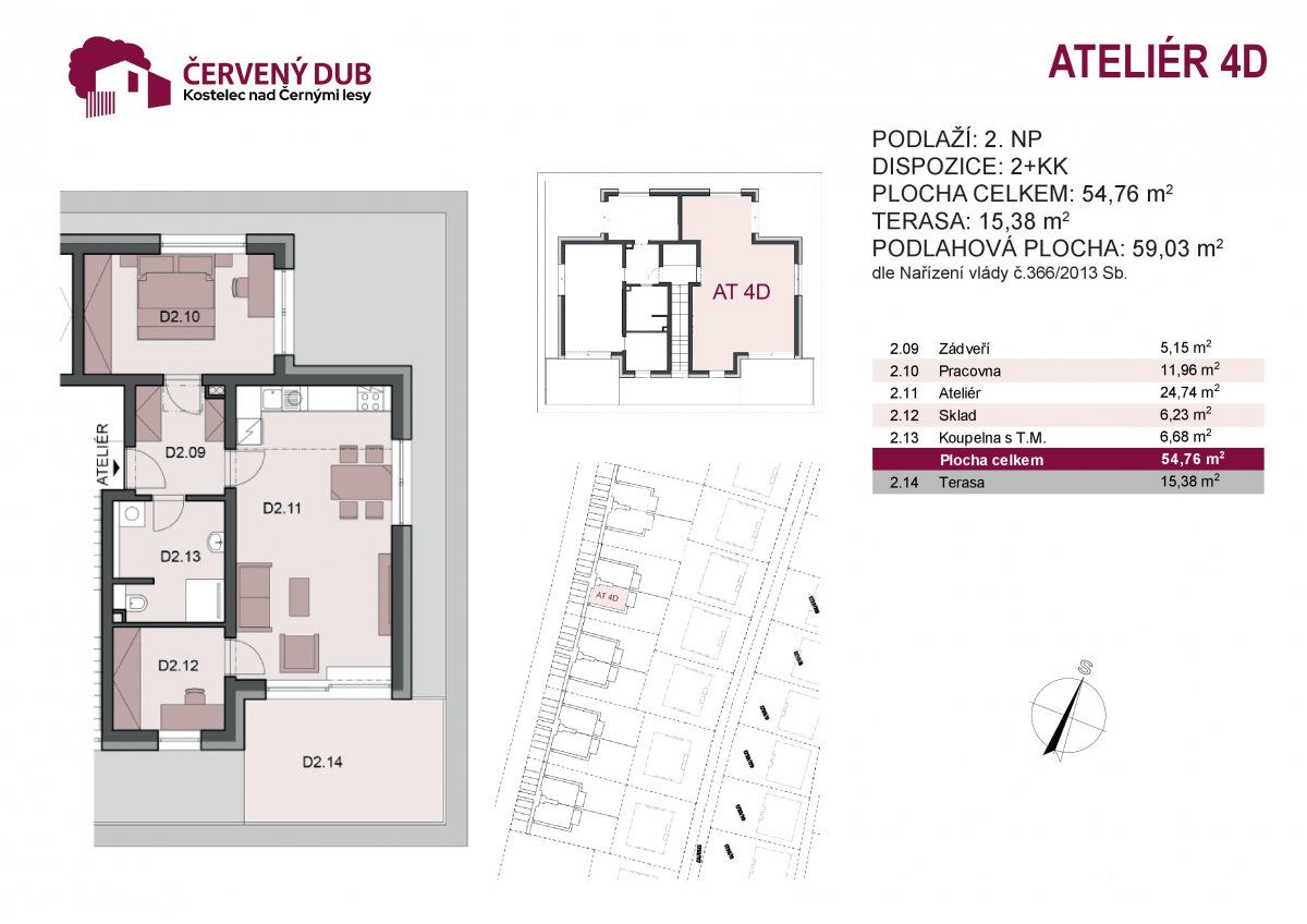 Nabízený byt se nachází v 2.NP domu č. 4, který je součástí výstavby 3. etapy projektu Červený dub, v Kostelci nad Černými lesy. V rámci této etapy vznikne 5 komorních domů, každý pouze o čtyřech jednotkách. Projekt je proto vynikajícím řešením pro ty, kdo upřednostňují klidnější a zdravější životní styl blízko přírodě s dobrým dojezdem do větších měst. V okolí projektu je krásná zvlněná lesnatá krajina, přičemž do Prahy nebo Říčan případně Českého Brodu dojedete v řádu desítek minut autem či autobusem, anebo kombinovaně i vlakem. Velkou předností domů projektu je soběstačnost ve výrobě elektrické energie. Všechny domy mají systém střešních fotovoltaických panelů. Energetická náročnost budovy je B – velmi úsporná.