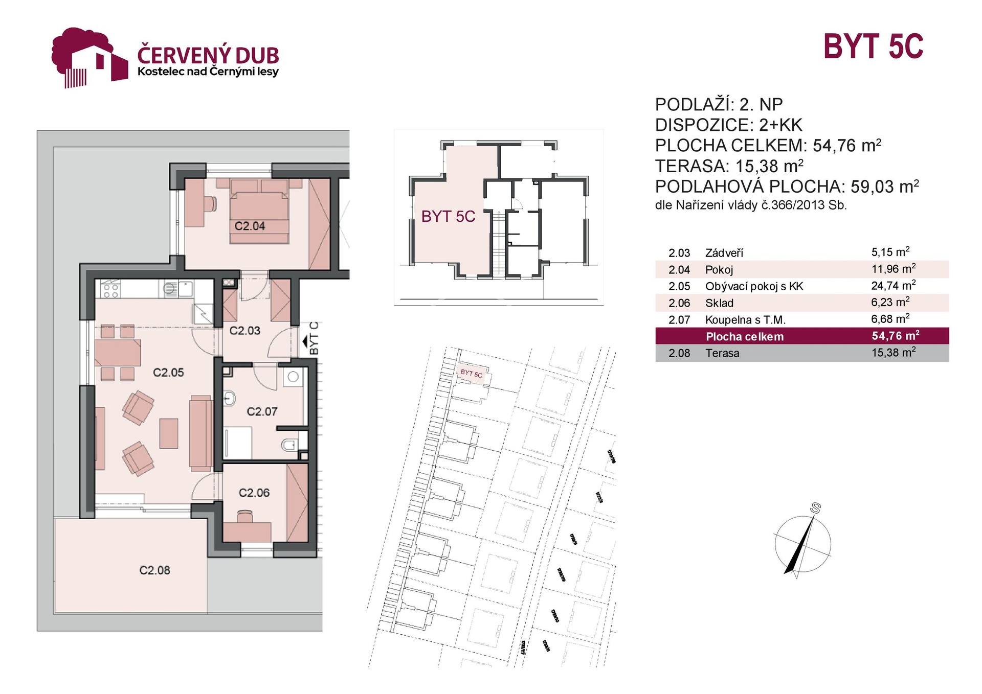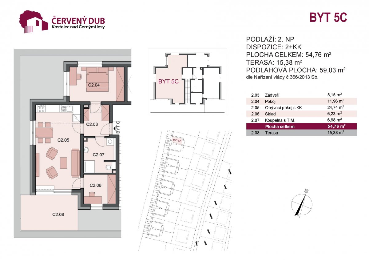 Nabízený byt se nachází v 2.NP domu č. 5, který je součástí výstavby 3. etapy projektu Červený dub, v Kostelci nad Černými lesy. V rámci této etapy vznikne 5 komorních domů, každý pouze o čtyřech jednotkách. Projekt je proto vynikajícím řešením pro ty, kdo upřednostňují klidnější a zdravější životní styl blízko přírodě s dobrým dojezdem do větších měst. V okolí projektu je krásná zvlněná lesnatá krajina, přičemž do Prahy nebo Říčan případně Českého Brodu dojedete v řádu desítek minut autem či autobusem, anebo kombinovaně i vlakem. Velkou předností domů projektu je soběstačnost ve výrobě elektrické energie. Všechny domy mají systém střešních fotovoltaických panelů. Energetická náročnost budovy je B – velmi úsporná.