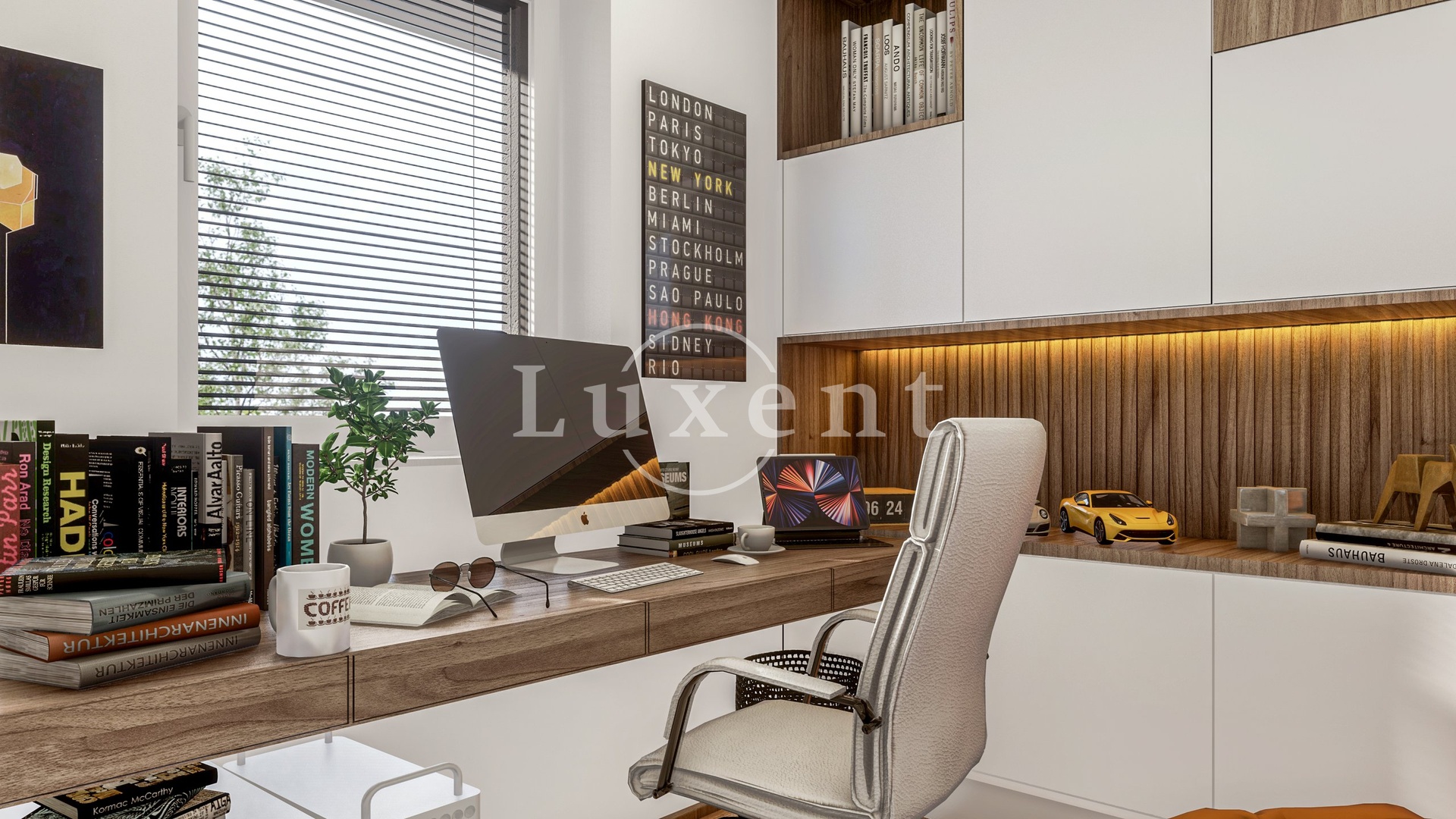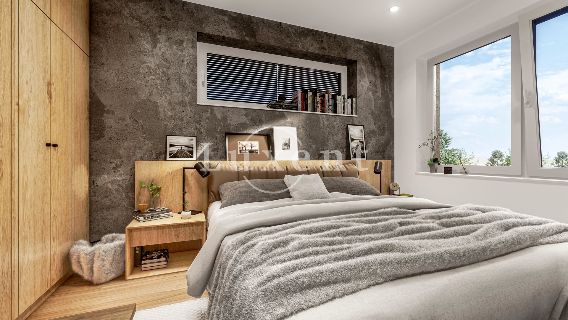 Byt je o dispozici 2+kk s terasou a situován je v 1. patře domu. Celková užitná plocha čítá 54,76 m2 plus 15,4 m2 terasy orientované na Z. Dispozice bytu je velmi praktická, všechny místnosti mají samostatný vstup. Ze zádveří s úložným prostorem se vstupuje do koupelny se sprchovým koutem a prostorem pro pračku a sušičku. Dále je zde obývací pokoj s přípravou pro kuchyň a výstupem na prostornou terasu. K obývacímu pokoji je připojena ještě jedna menší místnost, která může sloužit jako sklad nebo jako malá pracovna či šatna. V ložnici je prostor pro vestavěnou skříň nebo menší pracovní místo.