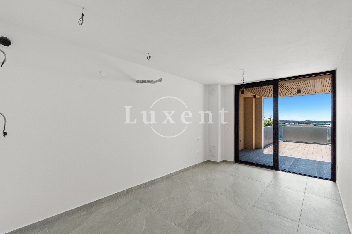 Byt nabízí otevřený obývací prostor o velikosti 18 m², který poskytuje dostatek místa pro pohodlné bydlení a relaxaci. Součástí je ložnice s klidným zázemím pro soukromí, šatna umožňující praktické uspořádání věcí a komora pro uložení všeho potřebného. Koupelna je vybavena prvotřídní sanitou značek Hansgrohe a Catalano. I přes kompaktní rozměry je interiér světlý a vzdušný díky velkým proskleným oknům, keramickým dlažbám a dřevěným parketám nejvyšší třídy. Z obývacího prostoru je vstup na krytou terasu o velikosti 19 m² s výhledem na moře, kde si můžete odpočinout, stolovat venku nebo vytvořit venkovní lounge.