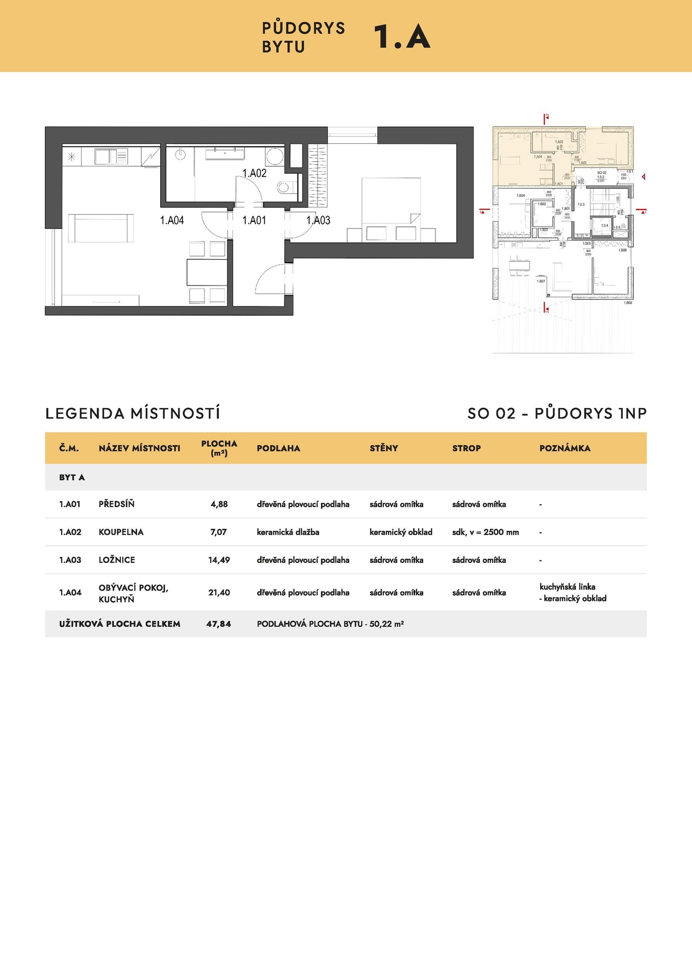 Byt o dispozici 2+kk a podlahové ploše 50,2 m2 se nachází v prvním nadzemním podlaží budovy B a zahrnuje předsíň se vstupem do koupelny se sprchovým koutem a toaletou. Dále se zde nachází ložnice a prostorný obývací pokoj s kuchyňským koutem.