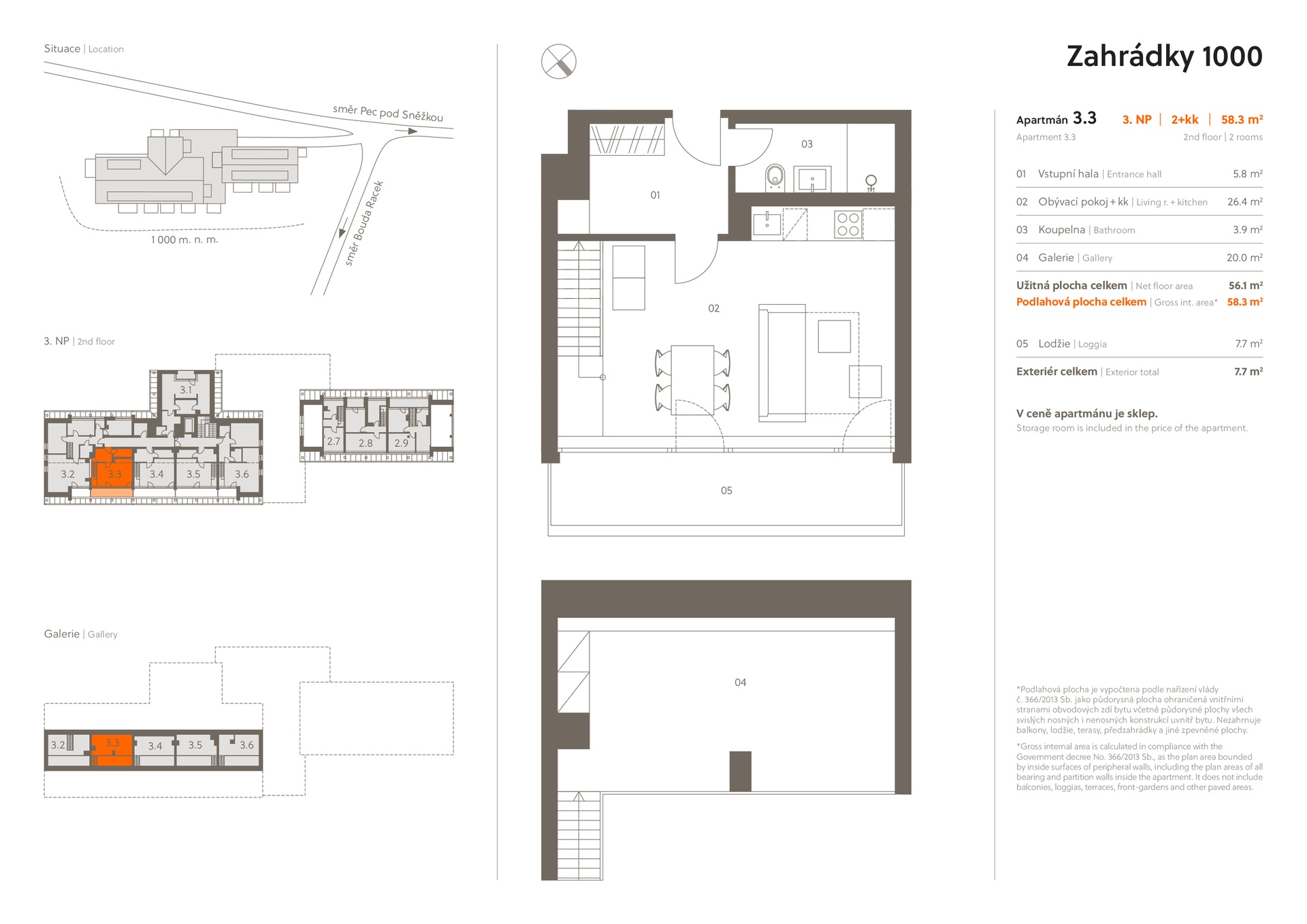 Nabízený mezonetový apartmán má dispozici 2+kk a celkovou plochu 56,1 m2 s lodžií 7,7 m2. Nabízí v přízemí obývací pokoj s prostupem na lodžii (S), koupelnu se sprchou a toaletou a v patře pak galerii jako ložnici.