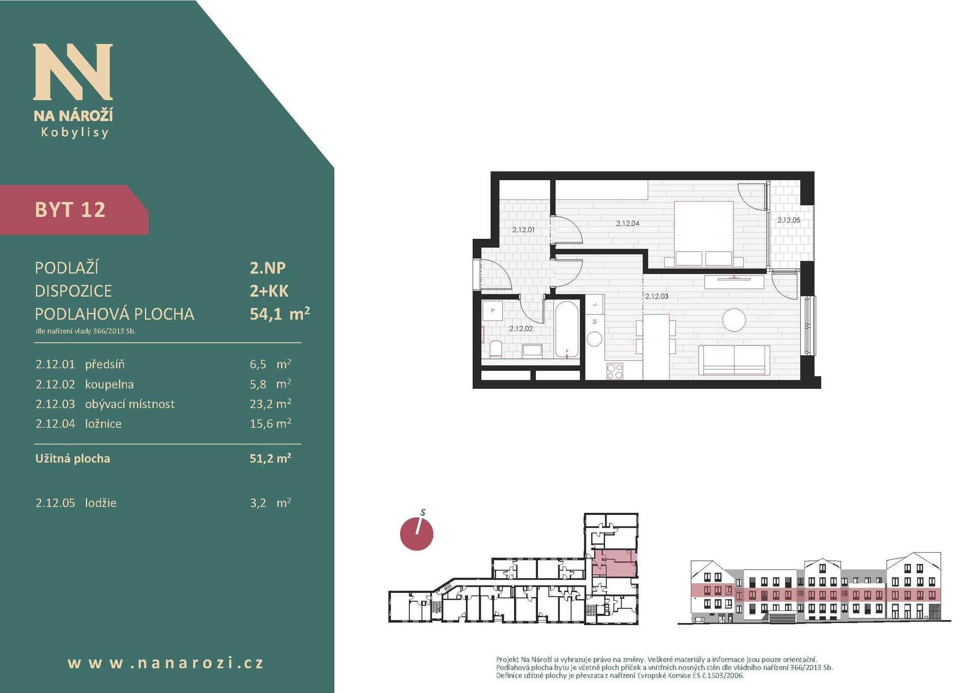 Tento byt 2+kk vznikne v projektu Na Nároží v pražských Kobylisích ve 2.NP moderního bytového domu v pěší dostupnosti metra. Podlahová plocha bytu je 54,1 m², celková plocha bytu včetně lodžie (3,2 m²) činí 54,4 m². K bytu náleží sklep, který je započten v ceně.