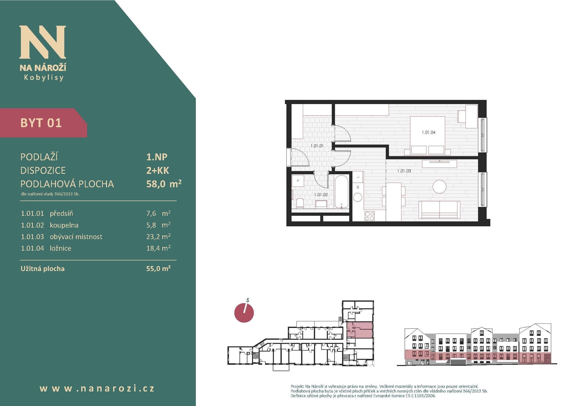 Tento byt 2+kk vznikne v projektu Na Nároží v pražských Kobylisích v 1.NP moderního bytového domu v pěší dostupnosti metra. Podlahová plocha bytu je 58 m², celková plocha bytu činí 55 m². K bytu navíc náleží sklep, který je započten v ceně.