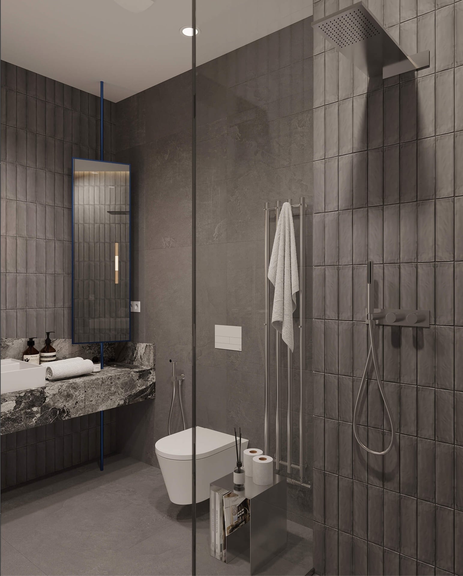 Koupelna je vybavena sanitou LAUFEN KARTELL, keramické obklady a dlažby EMIL CERAMICA v moderních odstínech dodávají koupelně nadčasový vzhled.