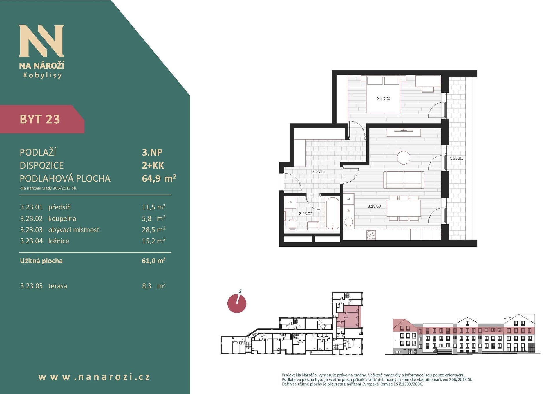 Tento byt 2+kk vznikne v projektu Na Nároží v pražských Kobylisích ve 3.NP moderního bytového domu v pěší dostupnosti metra. Podlahová plocha bytu je 64,9 m², celková plocha bytu včetně terasy (8,3 m²) činí 69,3 m². K bytu náleží sklep, který je započten v ceně.