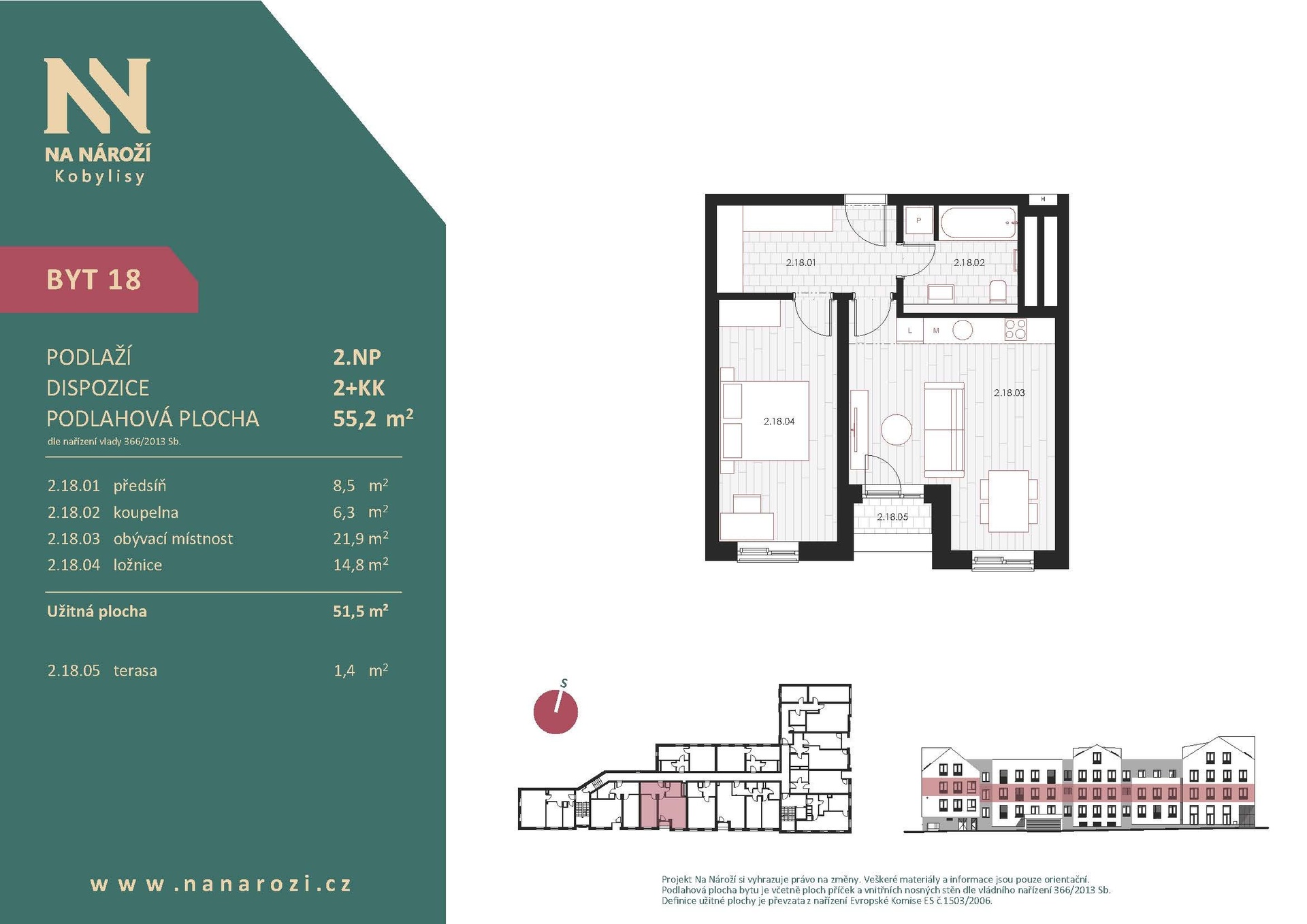 Tento byt 2+kk vznikne v projektu Na Nároží v pražských Kobylisích ve 2.NP moderního bytového domu v pěší dostupnosti metra. Podlahová plocha bytu je 55,2 m², celková plocha bytu včetně terasy (1,4 m²) činí 52,9 m². K bytu náleží sklep, který je započten v ceně.