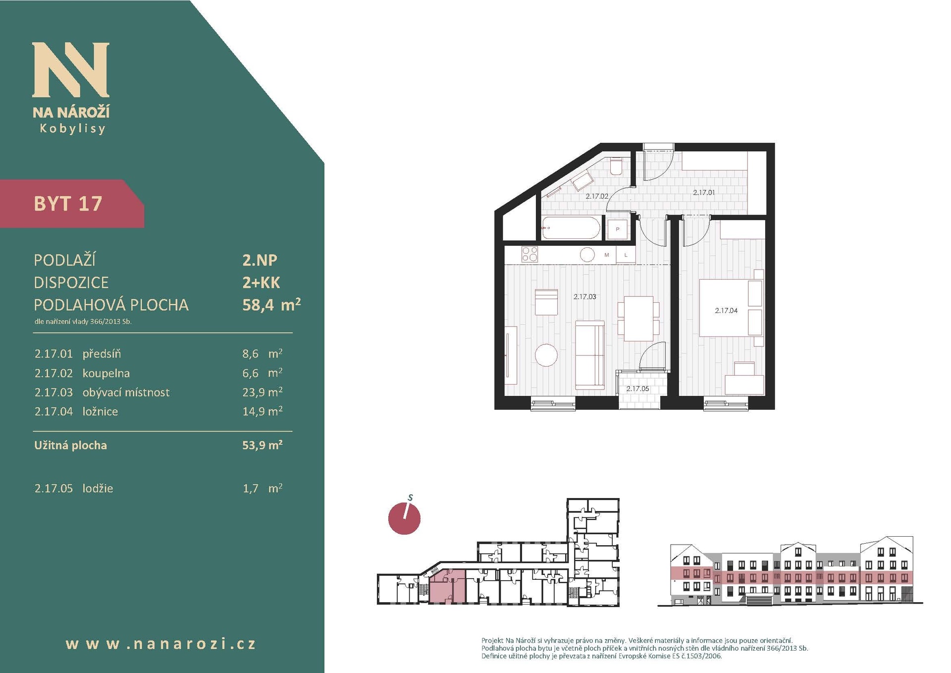 Tento byt 2+kk vznikne v projektu Na Nároží v pražských Kobylisích ve 2.NP moderního bytového domu v pěší dostupnosti metra. Podlahová plocha bytu je 58,4 m², celková plocha bytu včetně lodžie (1,7 m²) činí 55,6 m². K bytu náleží sklep, který je započten v ceně.