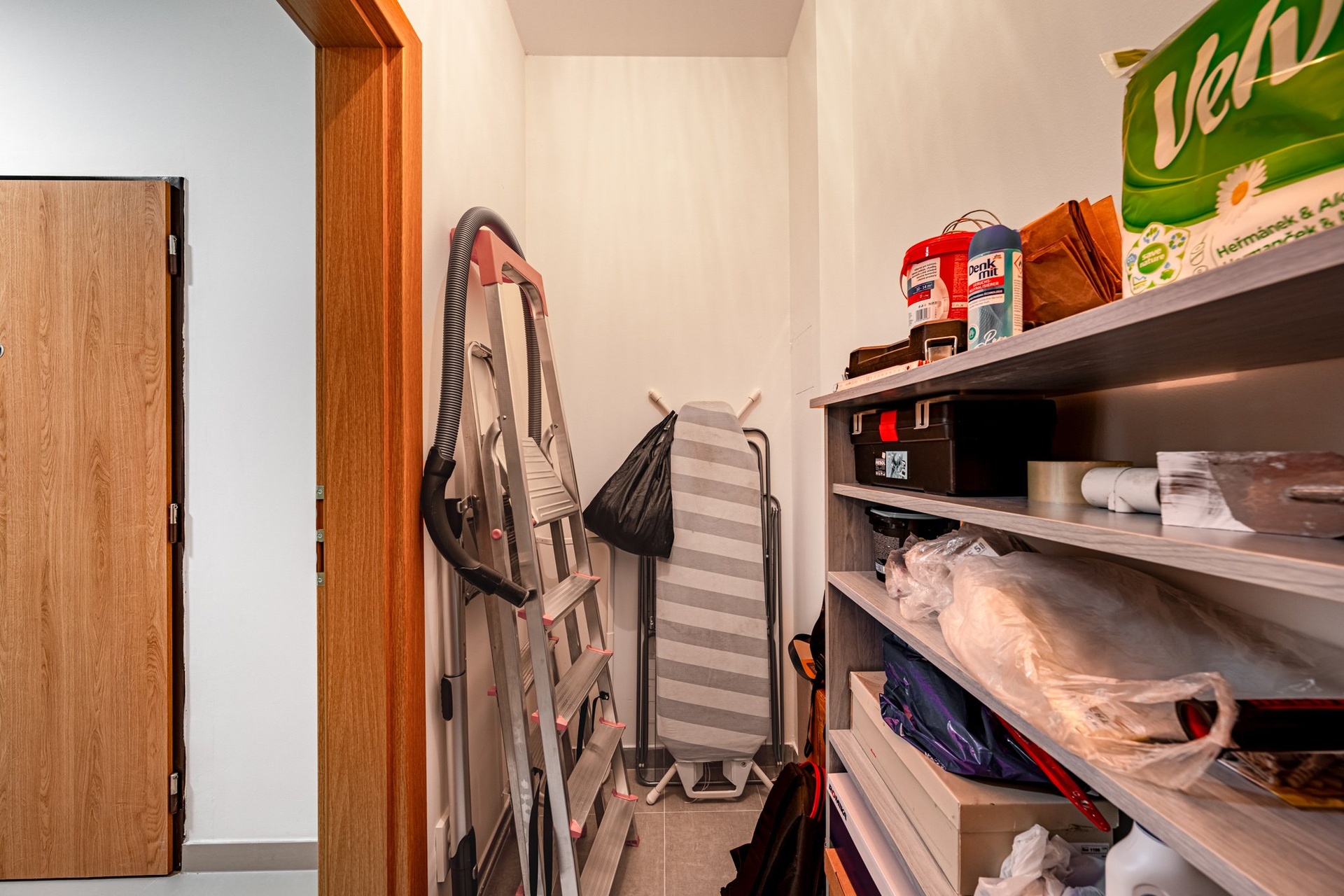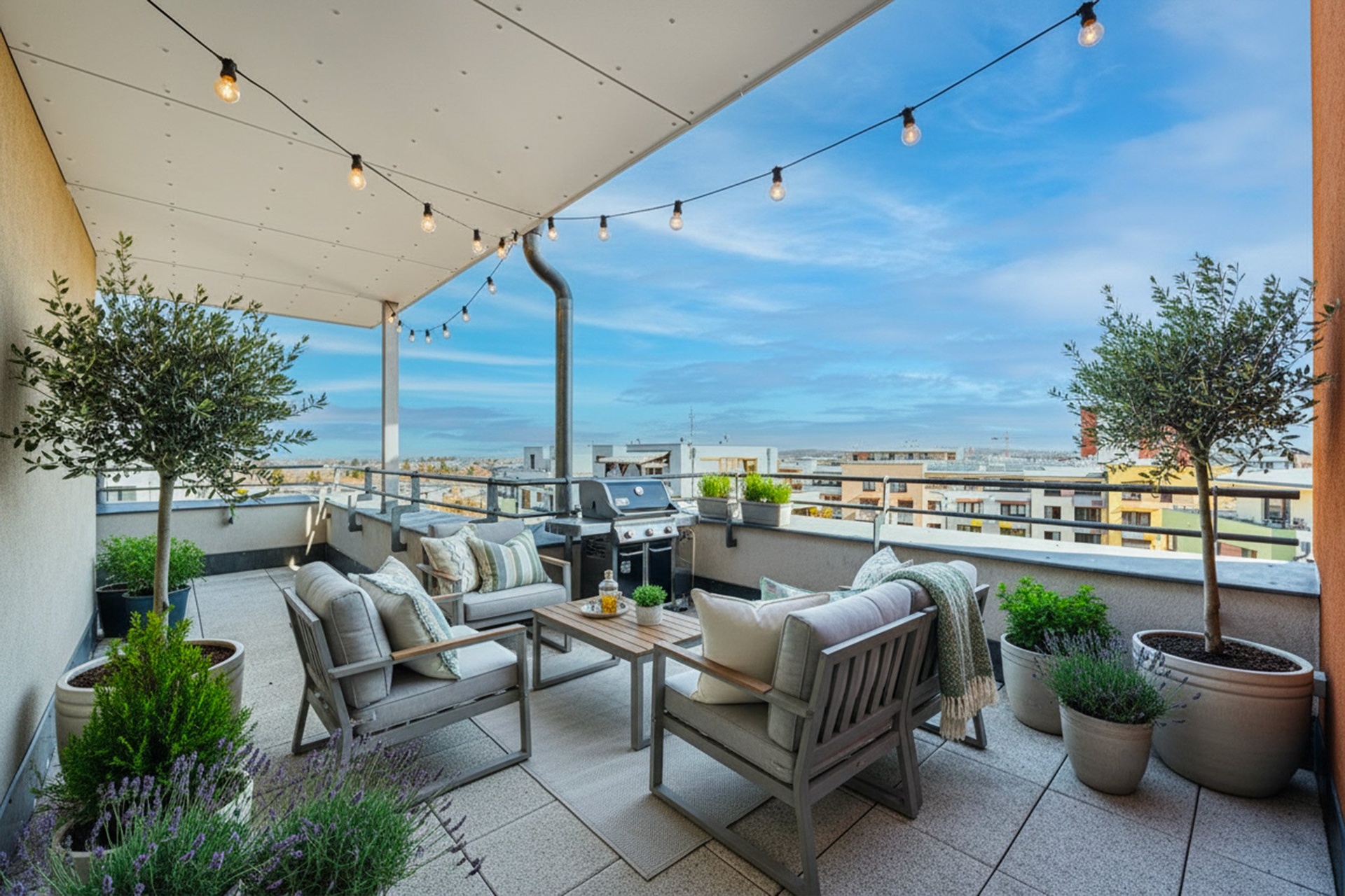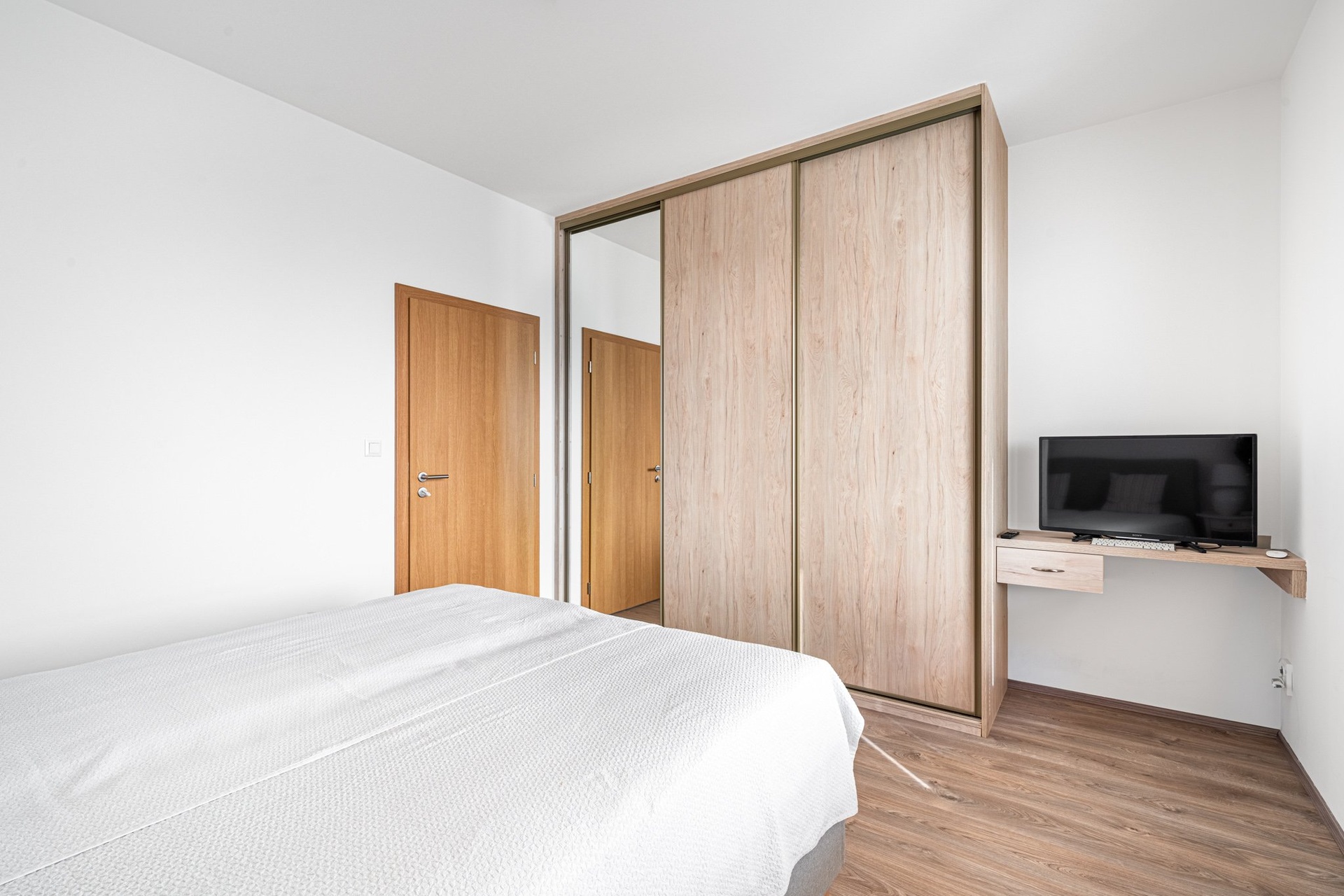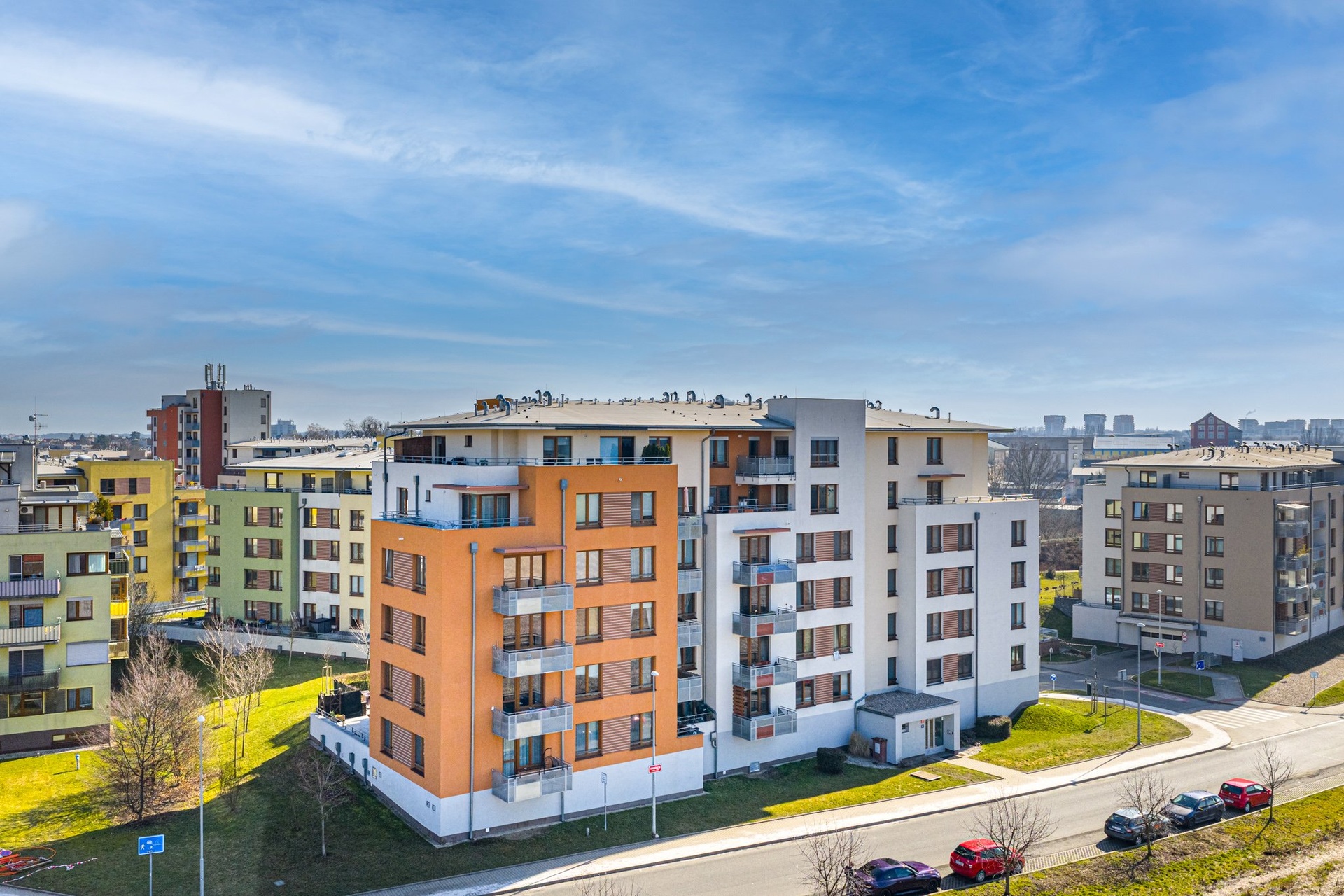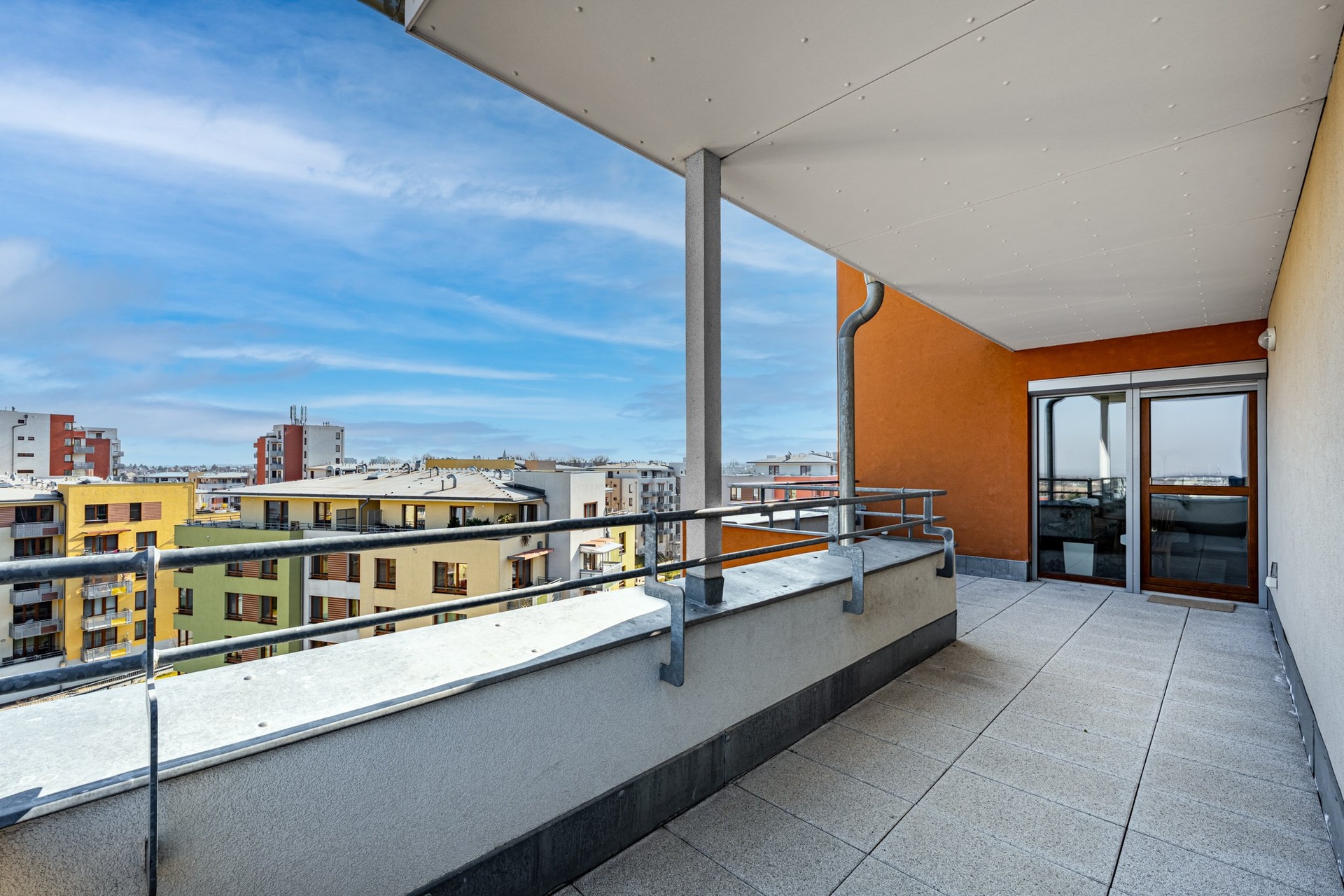 Byt se nachází v 6. nadzemním podlaží a jeho dispozice zahrnuje vstupní halu (7 m²), prostorný obývací pokoj s plně vybaveným kuchyňským koutem (31,8 m²), ložnici s vestavěnou šatní skříní (14,6 m²), praktickou komoru (2,6 m²) a koupelnu s WC (5,9 m²), která je vybavena vanou, topným tělesem a místem pro pračku. Z obývacího pokoje je vstup na velkorysou, částečně zastřešenou terasu (20 m²), která nabízí krásné výhledy do okolí. K bytu náleží také sklep a jedno garážové stání.