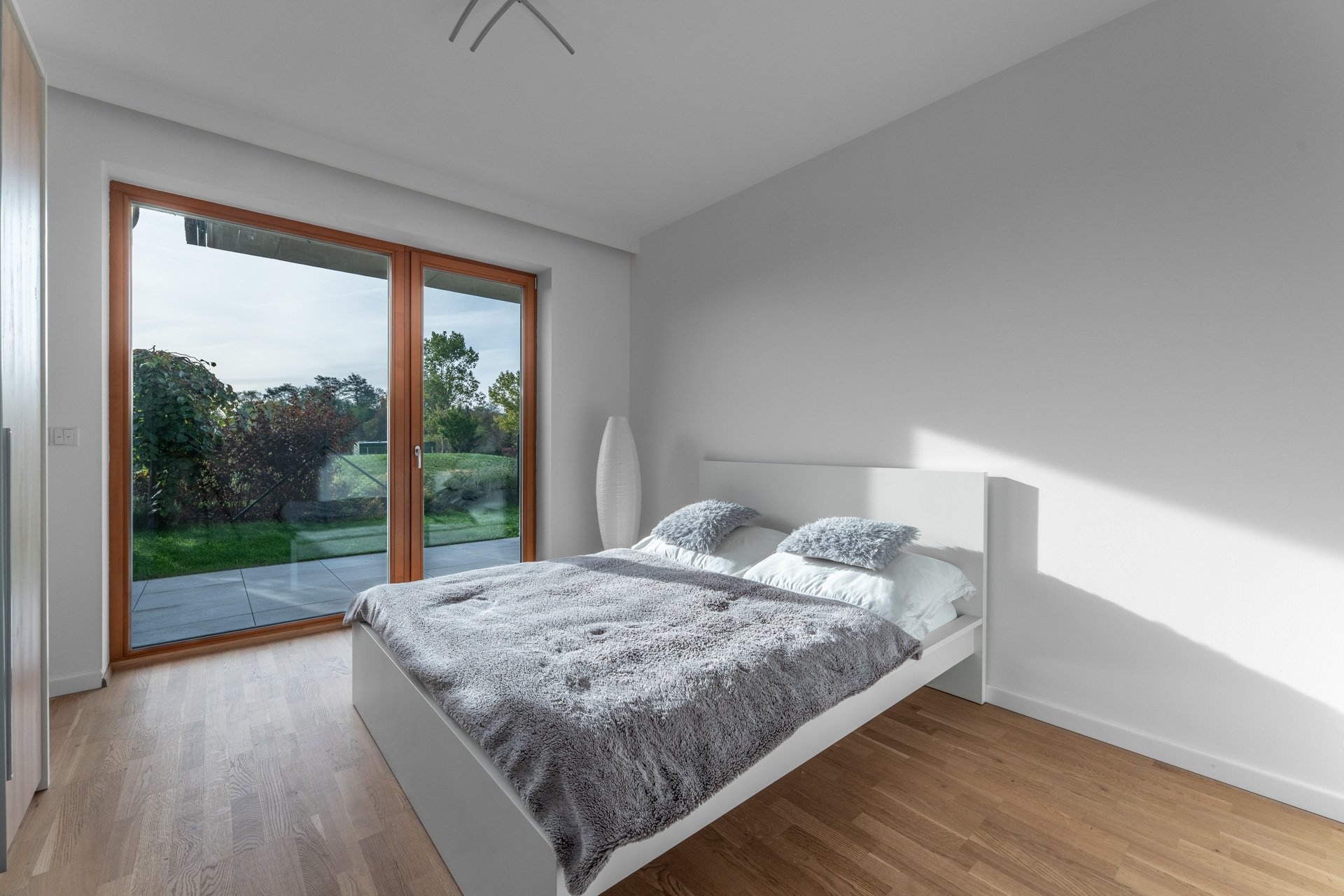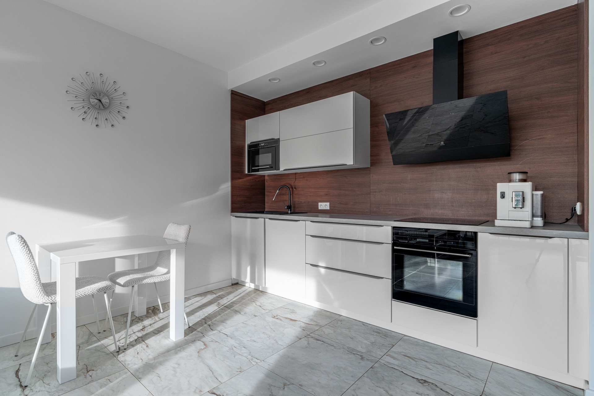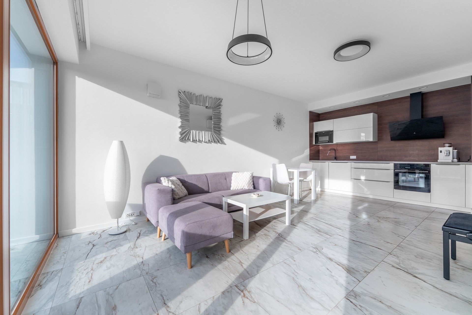 Byt má jednotný minimalistický a nadčasový design. V nemovitosti jsou použity kvalitní materiály, podlahové vytápění, rekuperace, velkoformátová dřevěná okna s trojskly a předokenními žaluziemi. V obývacím pokoji je umístěna klimatizační jednotka. Podlahová krytina byla zvolena v kombinaci dlažby a plovoucí dřevěné podlahy, která je v ložnici.