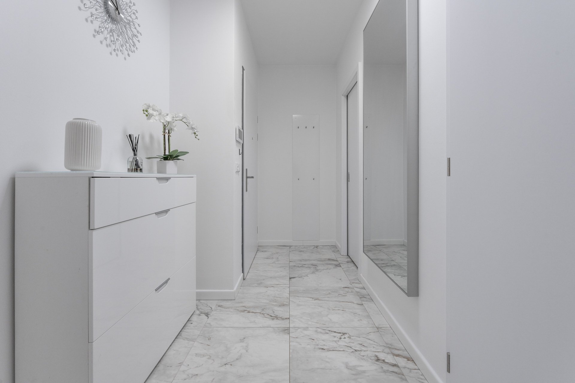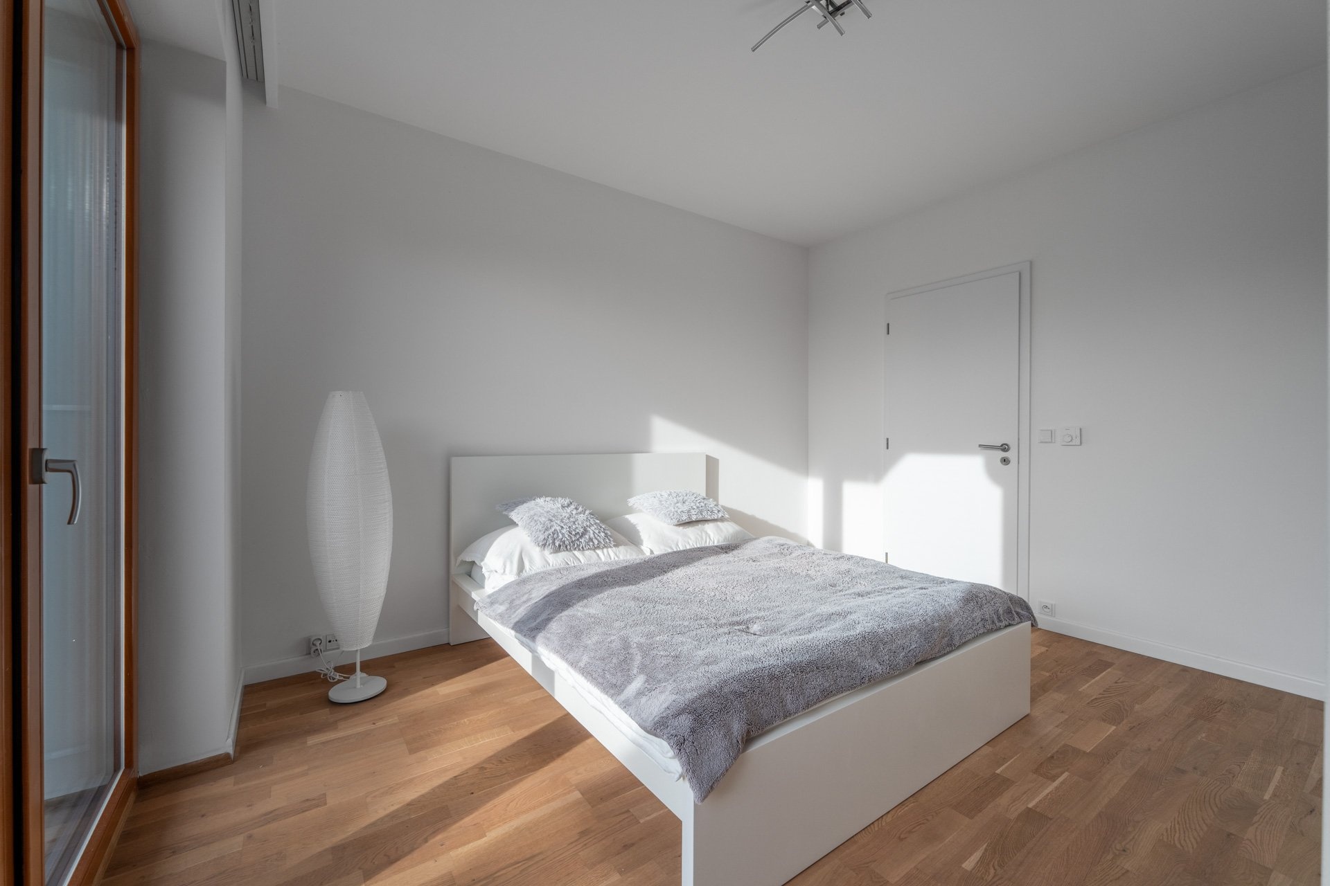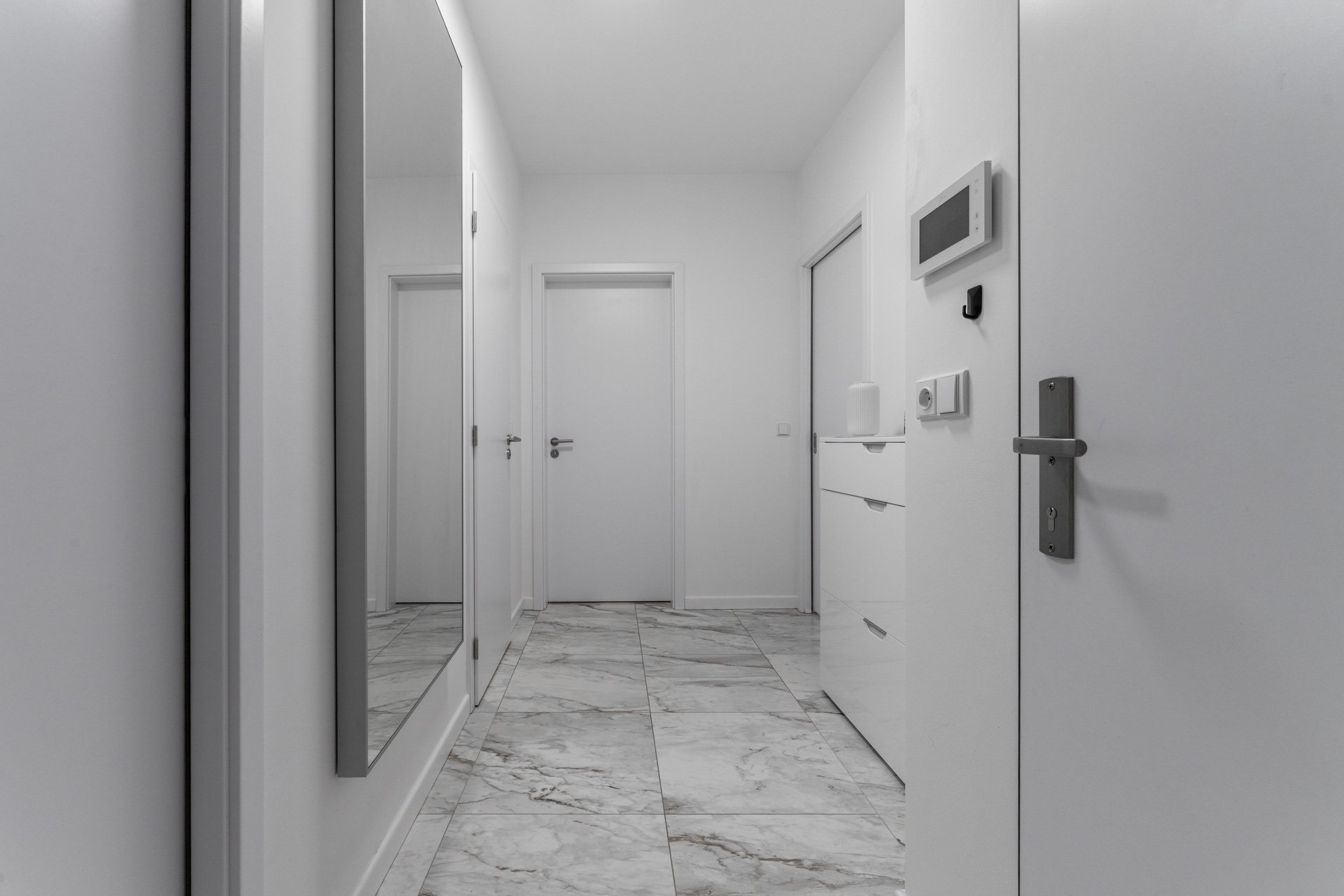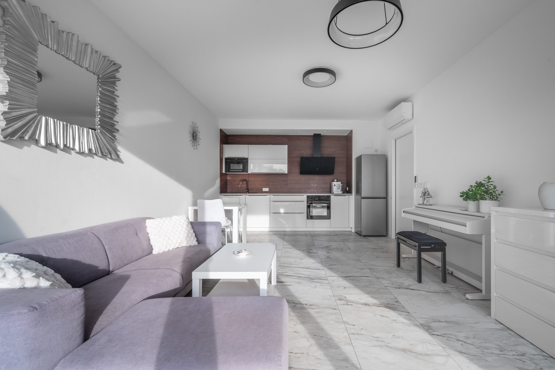 Byt má jednotný minimalistický a nadčasový design. V nemovitosti jsou použity kvalitní materiály, podlahové vytápění, rekuperace, velkoformátová dřevěná okna s trojskly a předokenními žaluziemi. V obývacím pokoji je umístěna klimatizační jednotka. Podlahová krytina byla zvolena v kombinaci dlažby a plovoucí dřevěné podlahy, která je v ložnici.