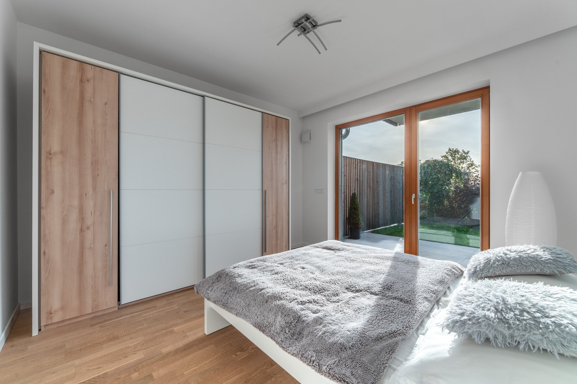 Byt je situován v 1.NP, interiér zahrnuje předsíň, velkorysý vzdušný obývací pokoj s kuchyní, ložnici, prostornou koupelnu s vanou, toaletou a komoru, kde je prostor pro pračku. Oba pokoje mají přímý vstup na předzahrádku, pro příjemné posezení, ale také propojení s přírodou a výhledy do atmosferické zahrady se vzrostlou zelení a jezírkem.