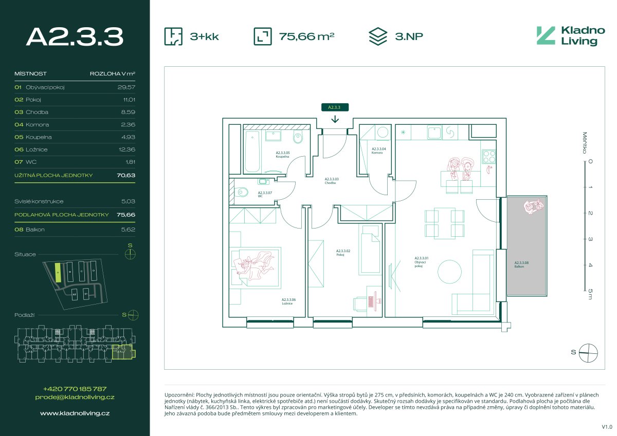 Nabízíme ke koupi moderní byt 3+kk o podlahové ploše 75,7 m² s balkonem 5,6 m² v rezidenčním projektu Kladno Living, který vzniká v jedné z nejatraktivnějších lokalit města Kladno – Kročehlavy. Tento nový developerský projekt představuje jedinečnou příležitost pro ty, kteří hledají nové byty v Kladně nebo investici do nemovitosti s vysokým potenciálem zhodnocení.