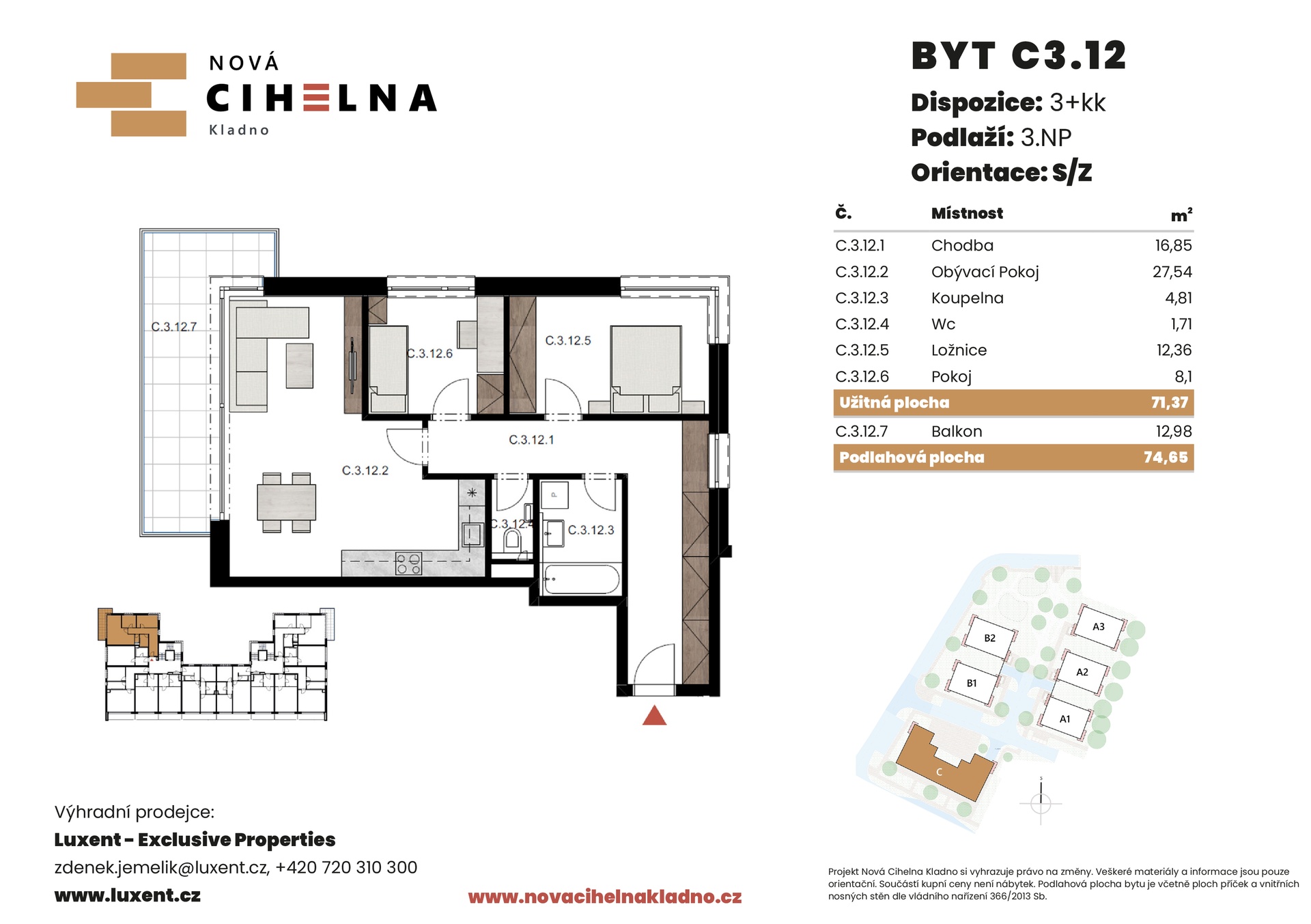 Nabízíme k prodeji byt 3+kk o podlahové ploše 74,65 m² s balkonem 12,98 m² v mimořádně úsporném developerském projektu Nová Cihelna Kladno vznikajícím v městské čtvrti Kladno – Rozdělov.