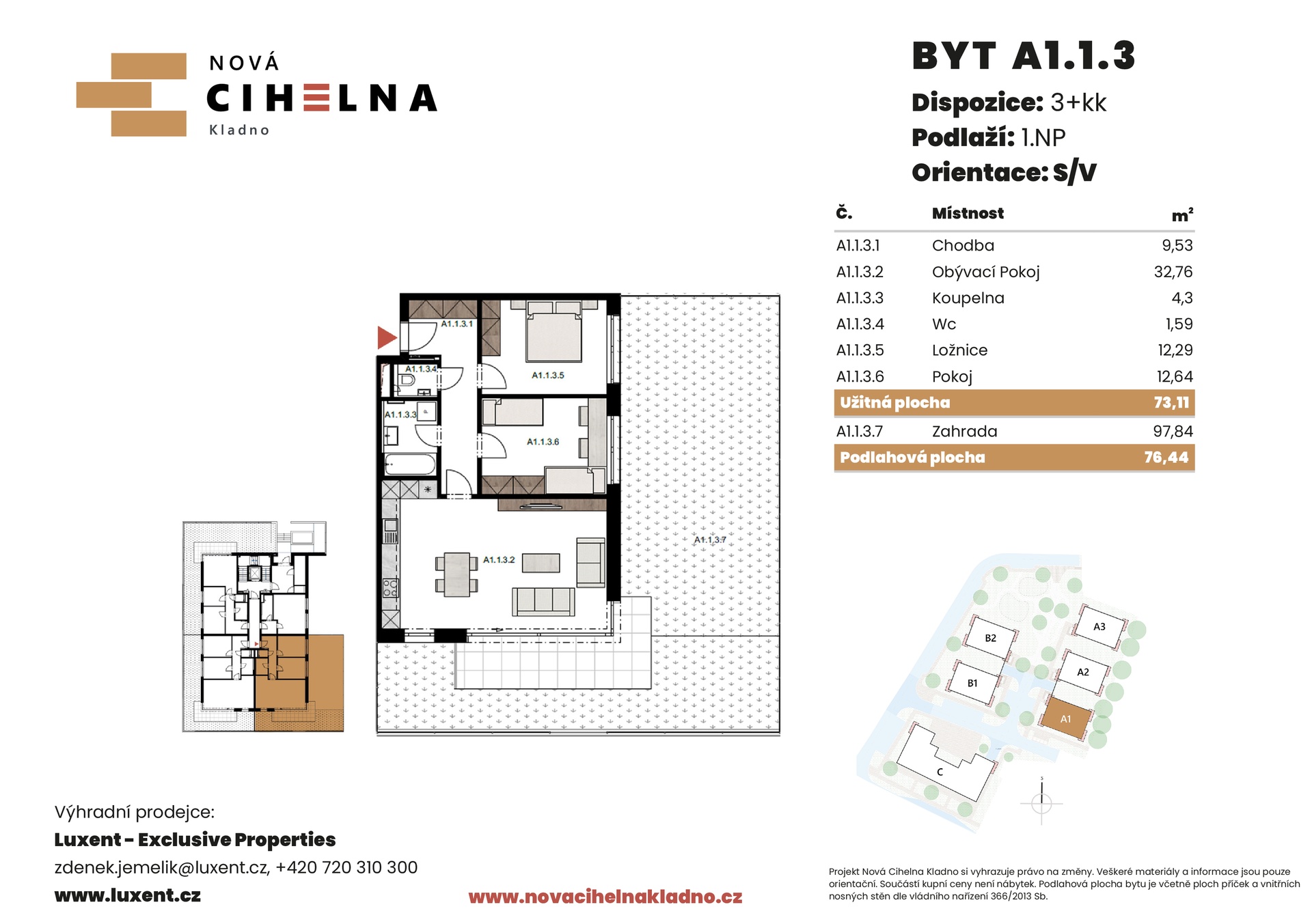 Nabízíme k prodeji byt 3+kk o podlahové ploše 76,44 m² se zahradou 97,84 m² v mimořádně úsporném developerském projektu Nová Cihelna Kladno vznikajícím v městské čtvrti Kladno – Rozdělov.