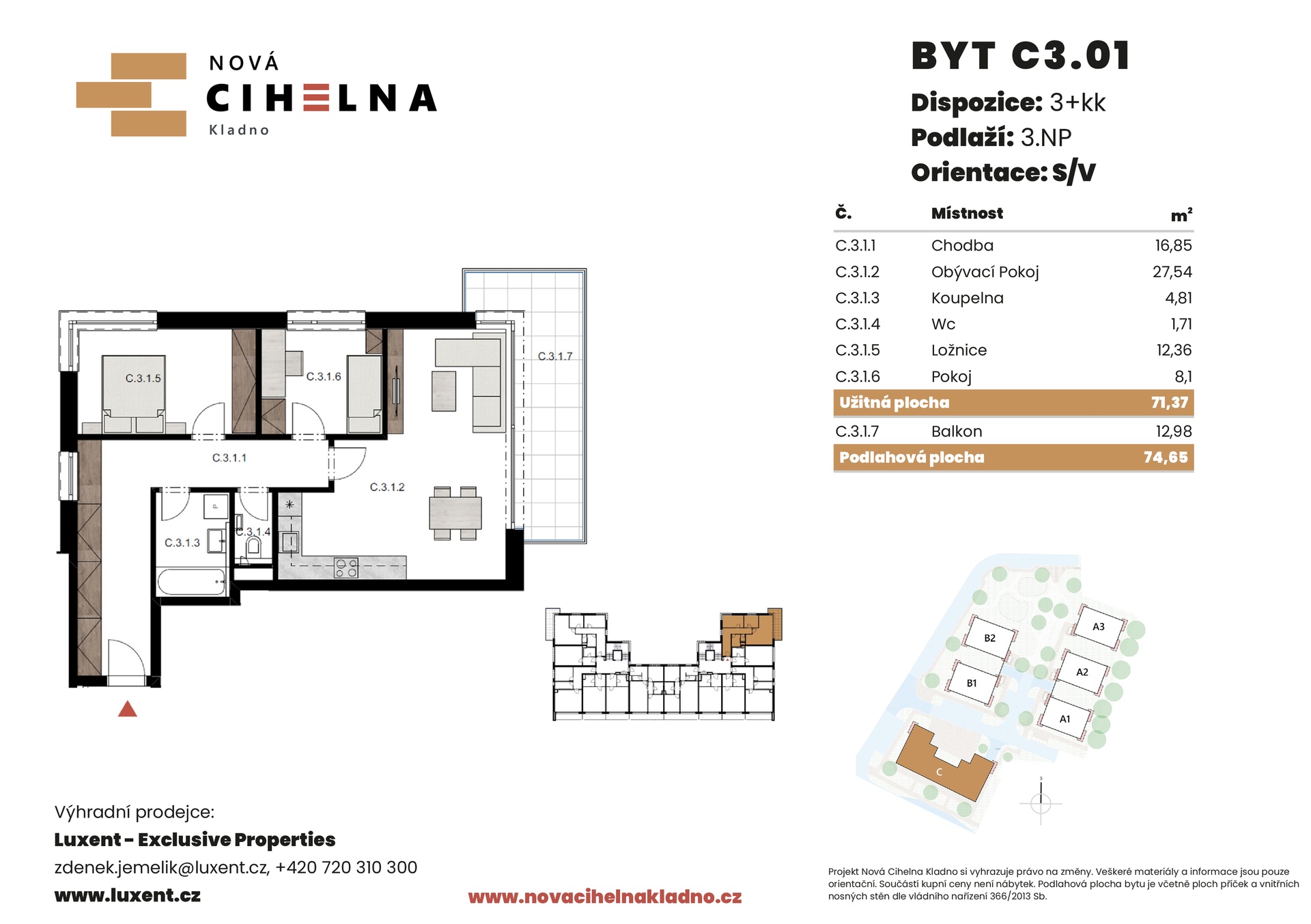Nabízíme k prodeji byt 3+kk o podlahové ploše 74,65 m² s balkonem 12,98 m² v mimořádně úsporném developerském projektu Nová Cihelna Kladno vznikajícím v městské čtvrti Kladno – Rozdělov.