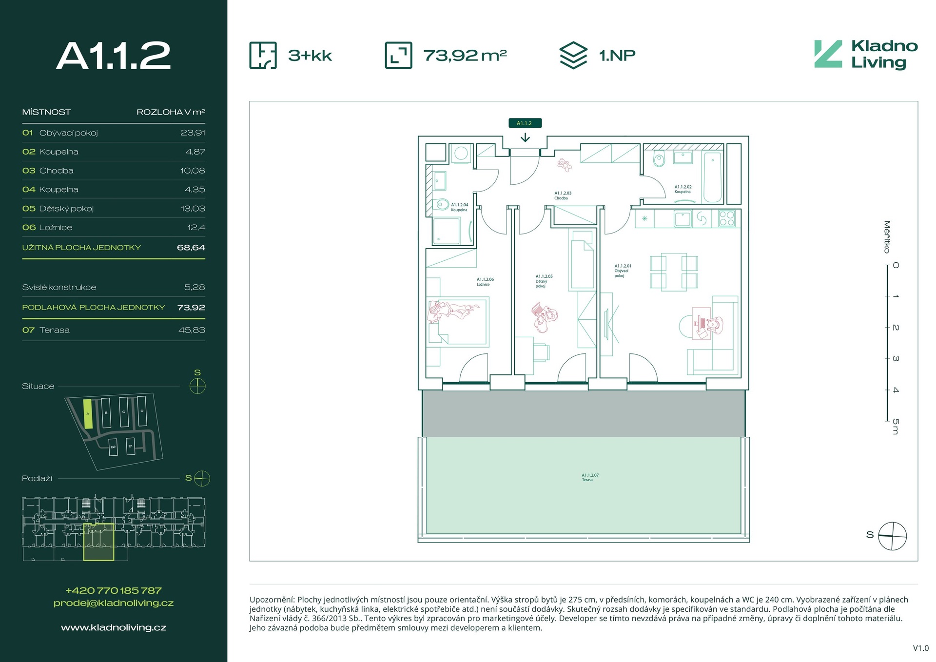 Nabízíme ke koupi moderní byt 3+kk o podlahové ploše 73,9 m² s terasou 45,8 m² v rezidenčním projektu Kladno Living, který vzniká v jedné z nejatraktivnějších lokalit města Kladno – Kročehlavy. Tento nový developerský projekt představuje jedinečnou příležitost pro ty, kteří hledají nové byty v Kladně nebo investici do nemovitosti s vysokým potenciálem zhodnocení.