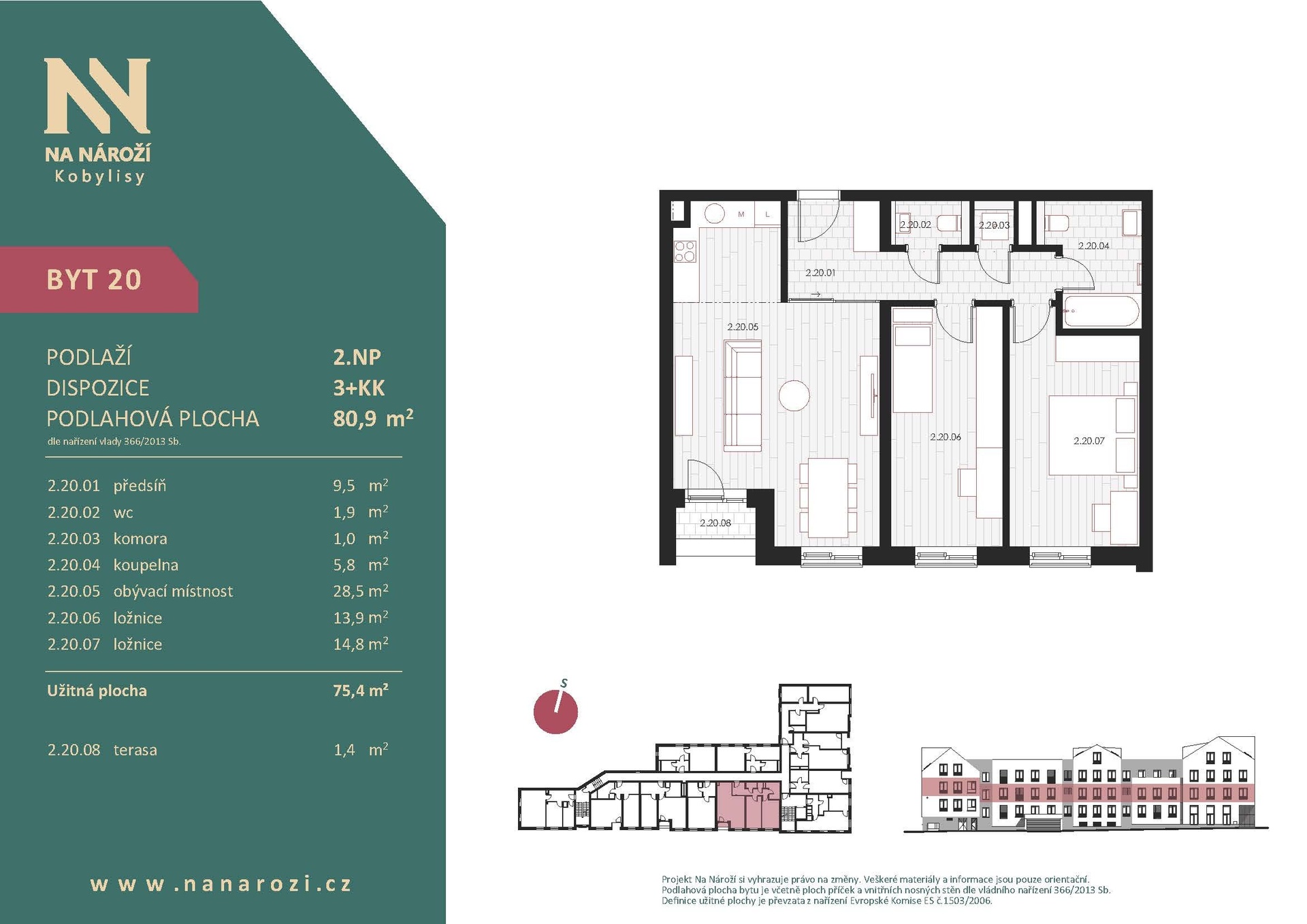 Tento byt 3+kk vznikne v projektu Na Nároží v pražských Kobylisích ve 2.NP moderního bytového domu v pěší dostupnosti metra. Podlahová plocha bytu je 80,9 m², celková plocha bytu včetně terasy (1,4 m²) činí 76,8 m². K bytu náleží sklep, který je započten v ceně.