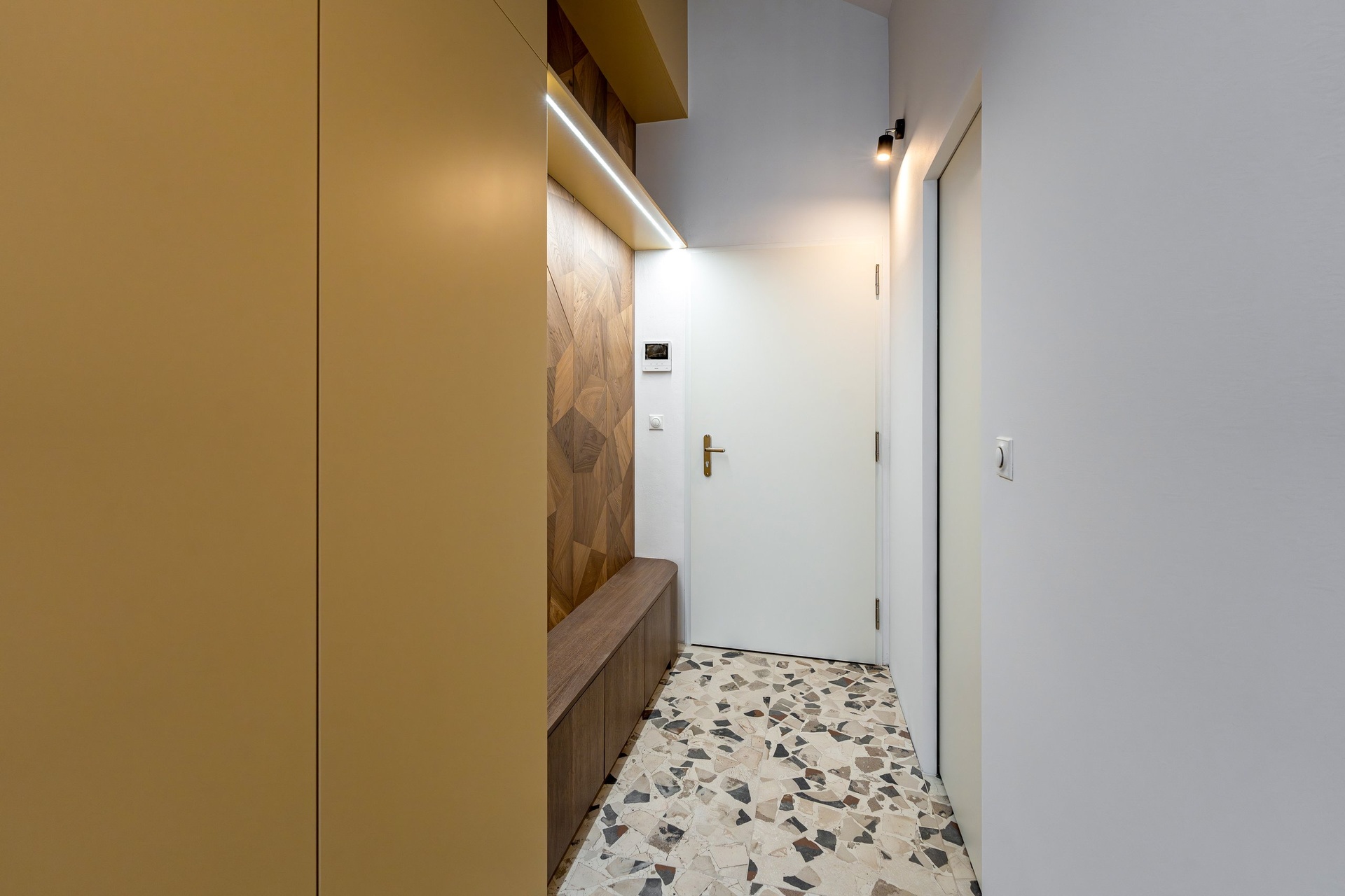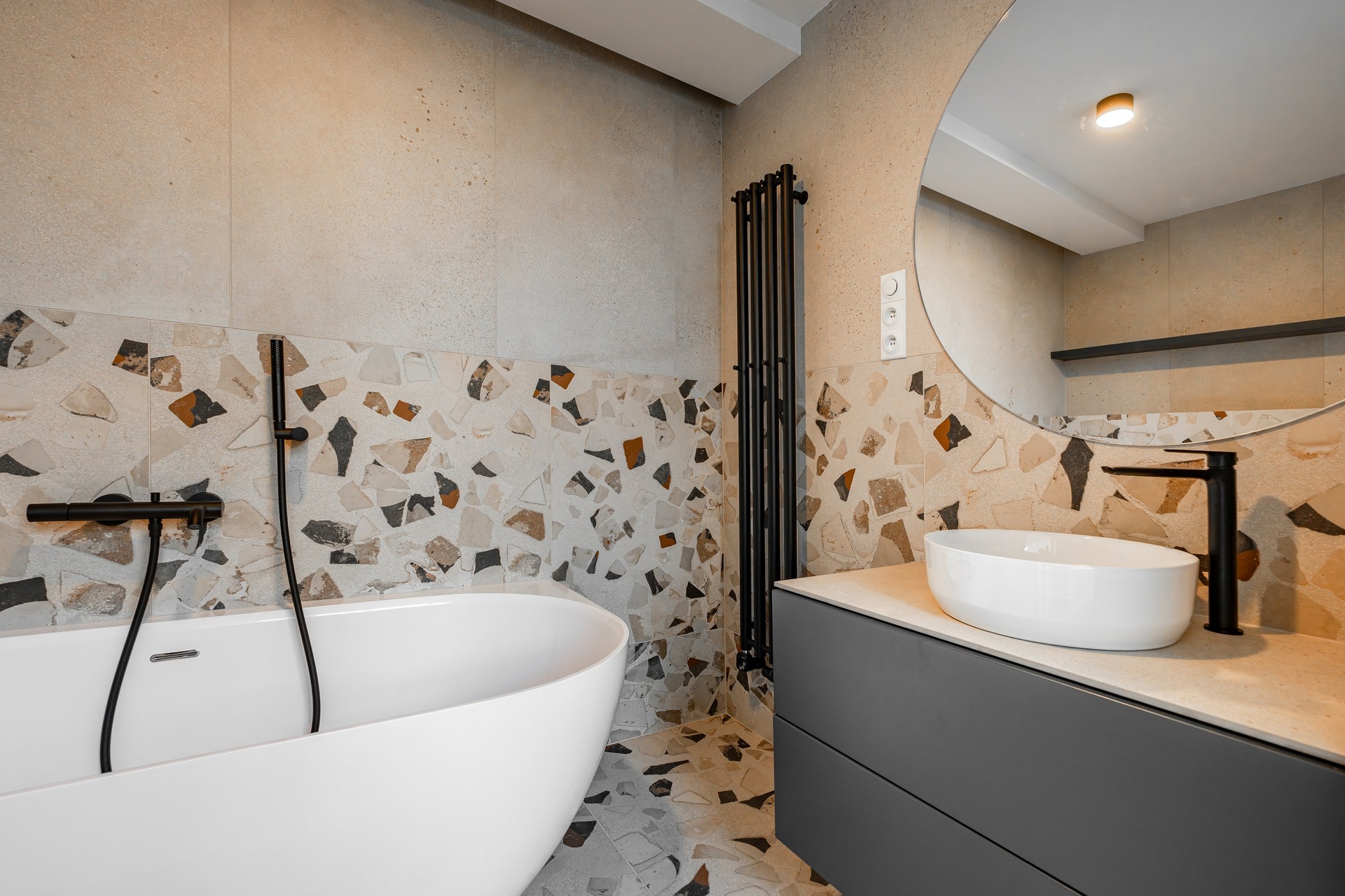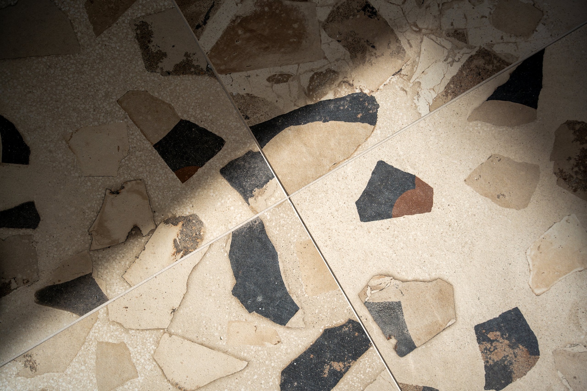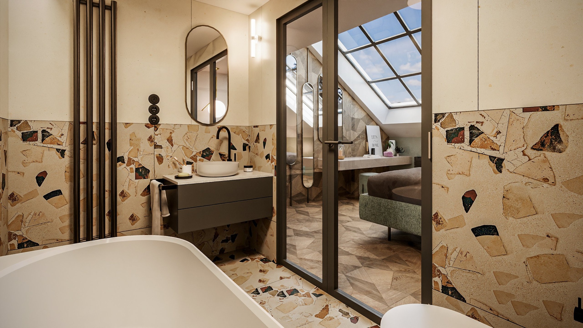 V koupelně a na chodbě je položena originální velkoformátová designová dlažba inspirovaná původním terazzem Cocci Calce Spaccato 900 × 900.