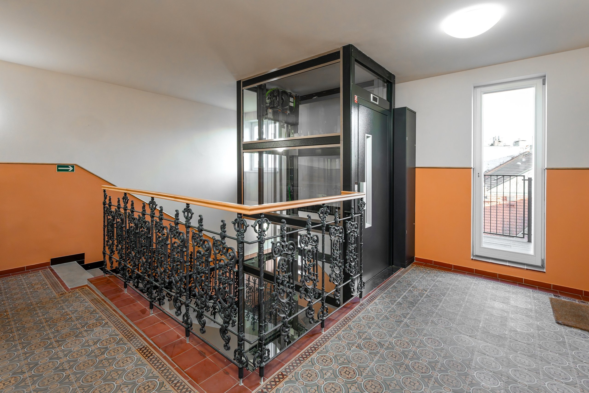 Obývací pokoj je otevřený až do hřebene střechy (4,6 m), má atypický tvar a je ozvláštněn masivním původním komínem, který podtrhuje originalitu celého bytu. Je zde příprava pro kuchyň s ostrůvkem, kombinovaná podlaha (dlažba, dřevo), prostor pro jídelnu a obývací část. V ložnici je pak vestavěná skříň a en-suite koupelna s prosklením, vanou, toaletou a individuálně vyrobeným kruhovým umyvadlem se skříňkou. Druhá koupelna u vchodu do bytu je vybavena sprchou, toaletou a má okno do světlíku. Z chodby vedou schody do horní úrovně bytu na prosvětlenou galerii s průhledem do obývacího pokoje. Pod schody je skříň pro uložení věcí a zázemí pro pračku. K bytu náleží sklep (8 m2).