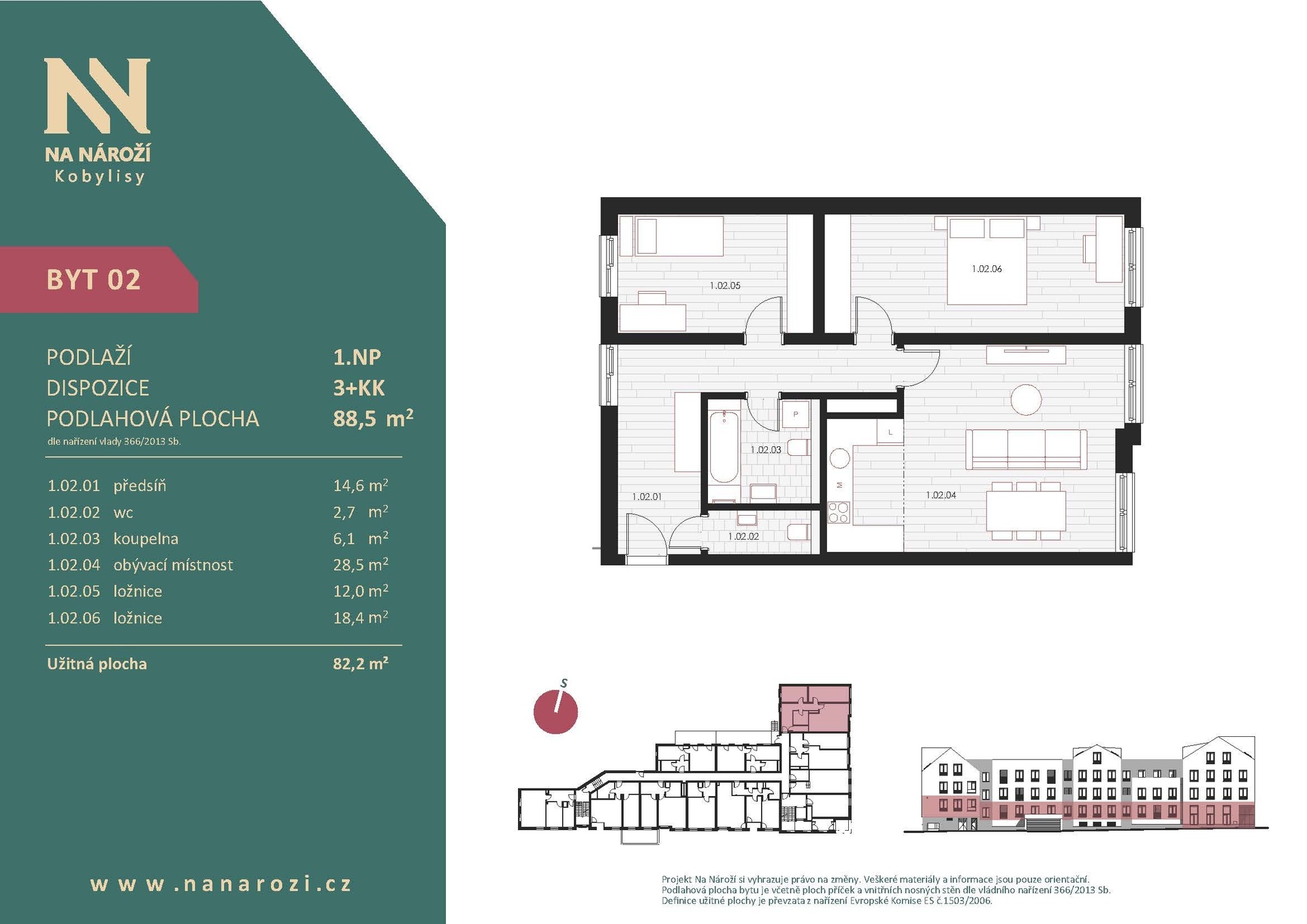 Tento byt 3+kk vznikne v projektu Na Nároží v pražských Kobylisích v 1.NP moderního bytového domu v pěší dostupnosti metra. Podlahová plocha bytu je 88,5 m², celková plocha bytu činí 82,2 m². K bytu náleží sklep, který je započten v ceně.