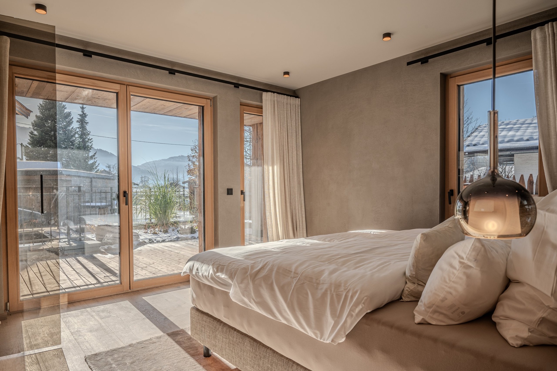 Horní patro nabízí prostorný obývací, jídelní a kuchyňský kout s vysokým stropem a velkými okny, které umožňují nádherný výhled na okolní hory. Kvalitní kuchyně je vybavena spotřebiči Miele, Bora a Qooker, což zaručuje prvotřídní zážitek z vaření. V přízemí se nachází luxusní hlavní ložnice s vlastní koupelnou a šatními skříněmi. Další dvě ložnice v suterénu jsou zařízeny exkluzivním nábytkem a mají vlastní koupelny.