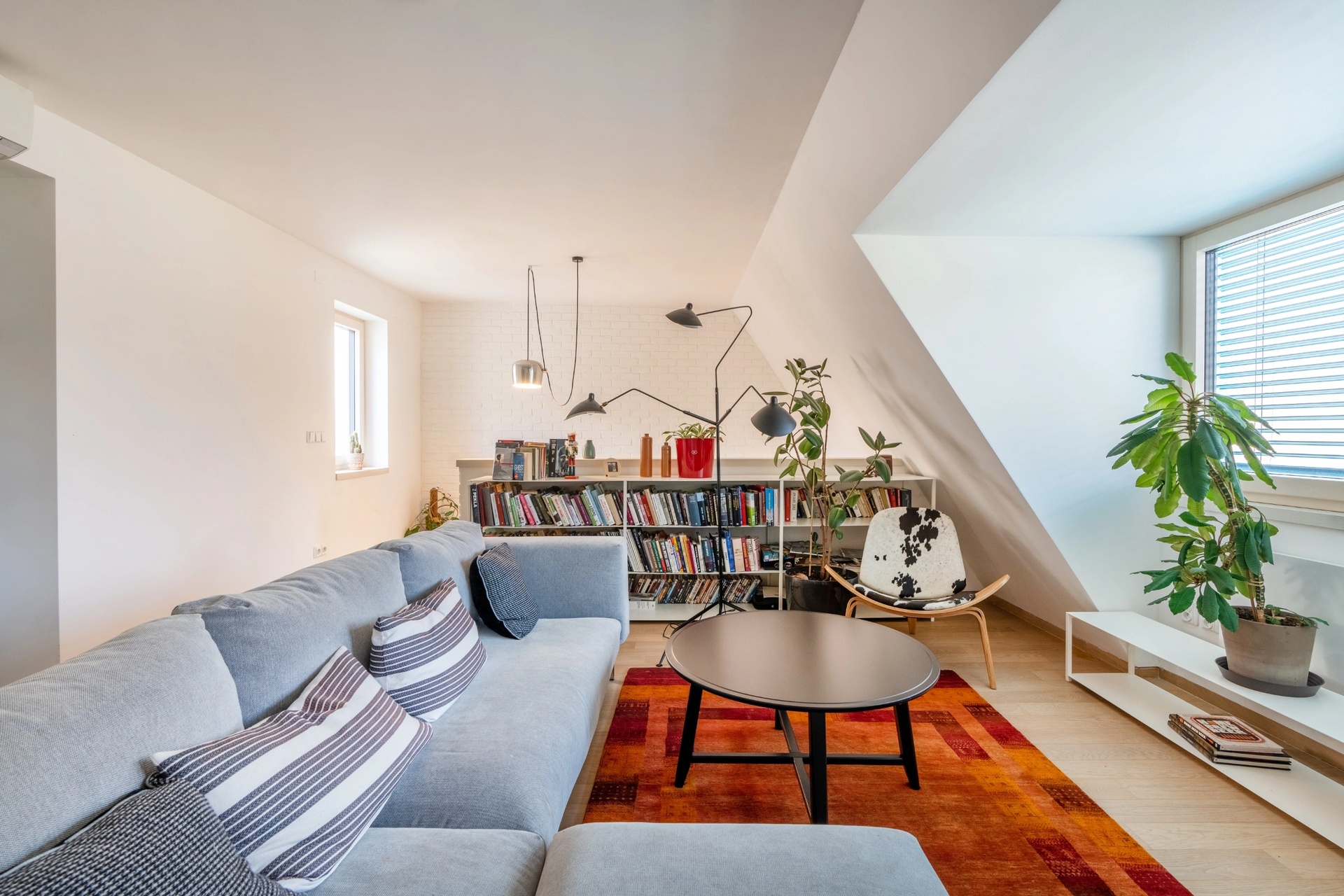 Byt o celkové výměře 507 m² je přístupný zastřešeným koridorem vedoucím z nádvoří. Z něj se vstupuje do chodby, odtud pak do dvou samostatných menších oddělených apartmánů (36 m² a 34 m²), vhodných na pronájem či na podnikání. Každý apartmán je vybaven vlastní kuchyňkou s jídelním koutem a sociálním zázemím. V této části je také vchod do hlavního bytu. V přízemí okolo hlavní haly (28 m²) se schodištěm jsou umístěné šatny, technická místnost a kotelna, sociální zázemí, úklidová místnost a sklady. Ve druhém nadzemním patře se nachází hlavní obytný prostor (62 m²) prosvětlený skleněnou stěnou a propojený s terasou (47 m²), jídelnou a kuchyní; pracovna (11 m²), další menší terasa (12 m²) a koupelna s toaletou. Schodištěm nebo výtahem se dostaneme do třetího nadzemního patra se dvěma ložnicemi (14 m² a 18 m²), dvěma terasami (3 m² a 7 m²), šatnou a velkoryse řešenou koupelnou s vanou, sprchovým koutem a saunou (17 m²). Na posledním patře je umístěna hlavní ložnice (25 m²) s pracovnou a knihovnou (25 m²), šatnou, koupelnou a terasou. Z koupelny (8 m²) se vchází na terasu (7 m²), ze které je výhled na charakteristickou barokní střechu kostela Sv. Mikuláše na Malostranském náměstí.