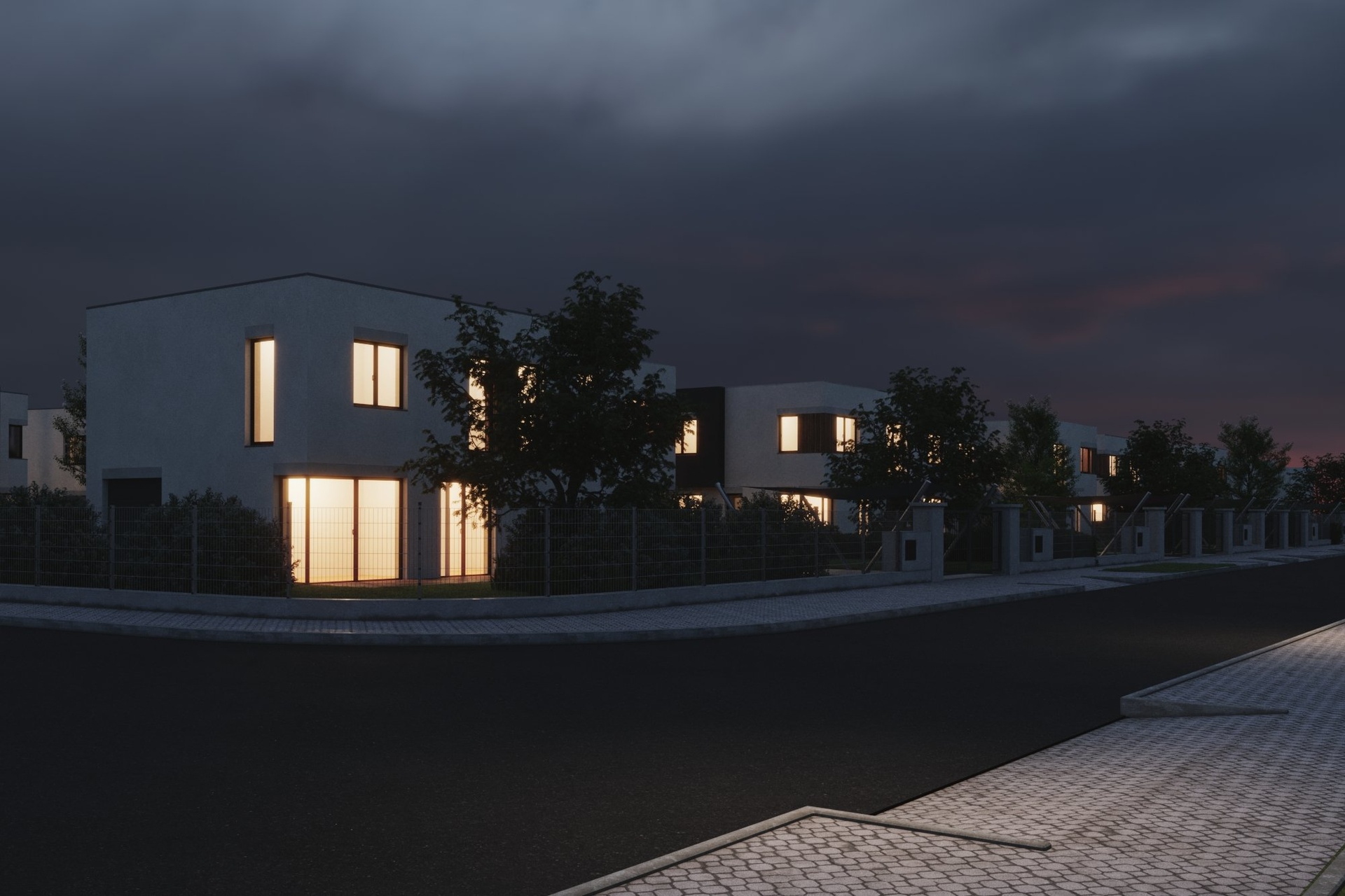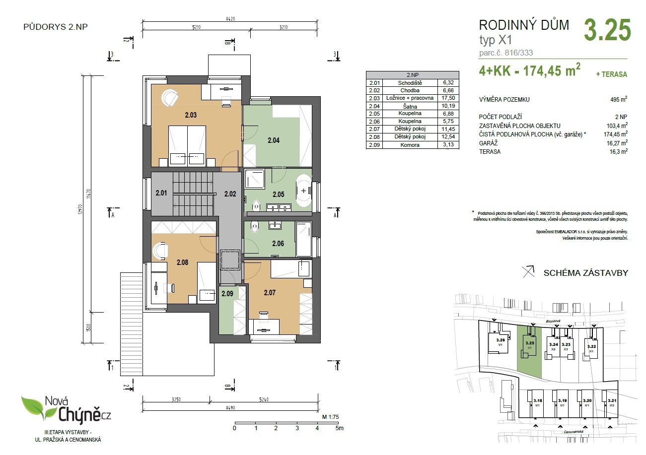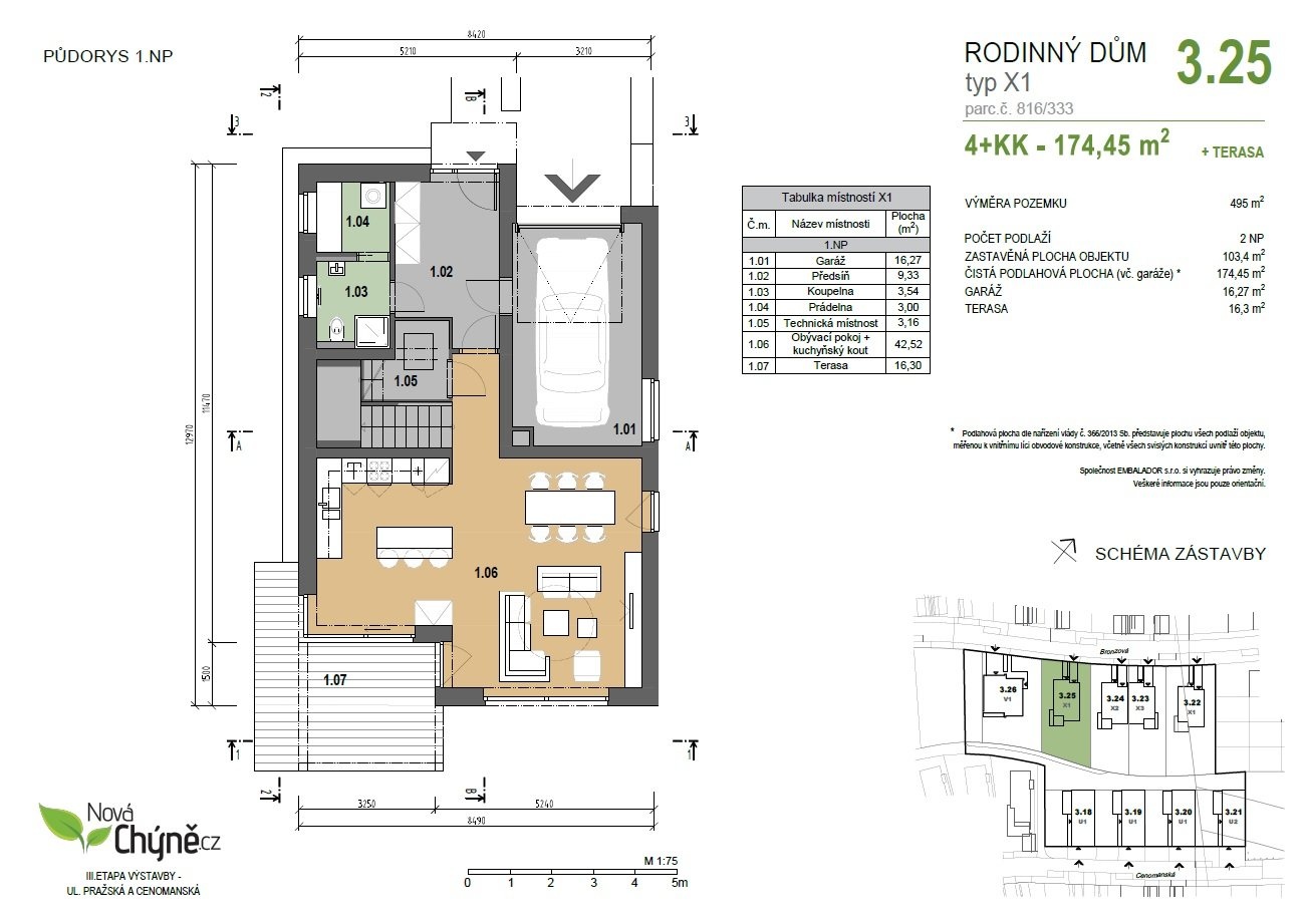 Nabízíme samostatný rodinný dům se slunnou zahradou v projektu Nová Chýně, na západním okraji Prahy – ve městě Chýně – s dojezdem 14 km do centra Prahy. Projekt uspokojí lokalitou, kvalitou zděných domů s praktickými dispozicemi a zahradami i technologickou promyšleností. Nabízený rodinný má dispozici 4+kk, podlahovou plochu 174,4 m2, terasu 16,3 m2. Stojí na pozemku o rozloze 495 m2 se zahradou 391 m2. Součástí domu je garáž pro jeden vůz a jedno další park. stání je na vlastním pozemku.