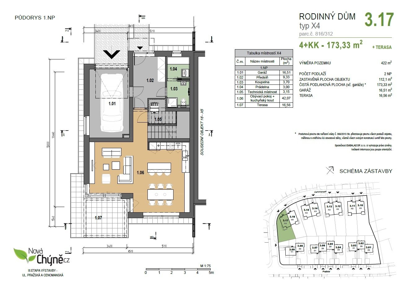 Nabízíme rohový rodinný dům se slunnou zahradou v projektu NOVÁ CHÝNĚ, na západním okraji Prahy – ve městě Chýně – s dojezdem 14 km do centra Prahy. Projekt uspokojí kvalitou lokalitou, zděných domů s praktickými dispozicemi a zahradami i technologickou promyšleností. Nabízený dům má dispozici 4+kk, podlahovou plochu 173,3 m2, celkovou užitnou plochu 174,3 m2, z toho terasu 16,6 m2. Stojí na pozemku o rozloze 422 m2 se zahradou 310 m2. Součástí domu je garáž pro jeden vůz a jedno další park. stání je na vlastním pozemku.
