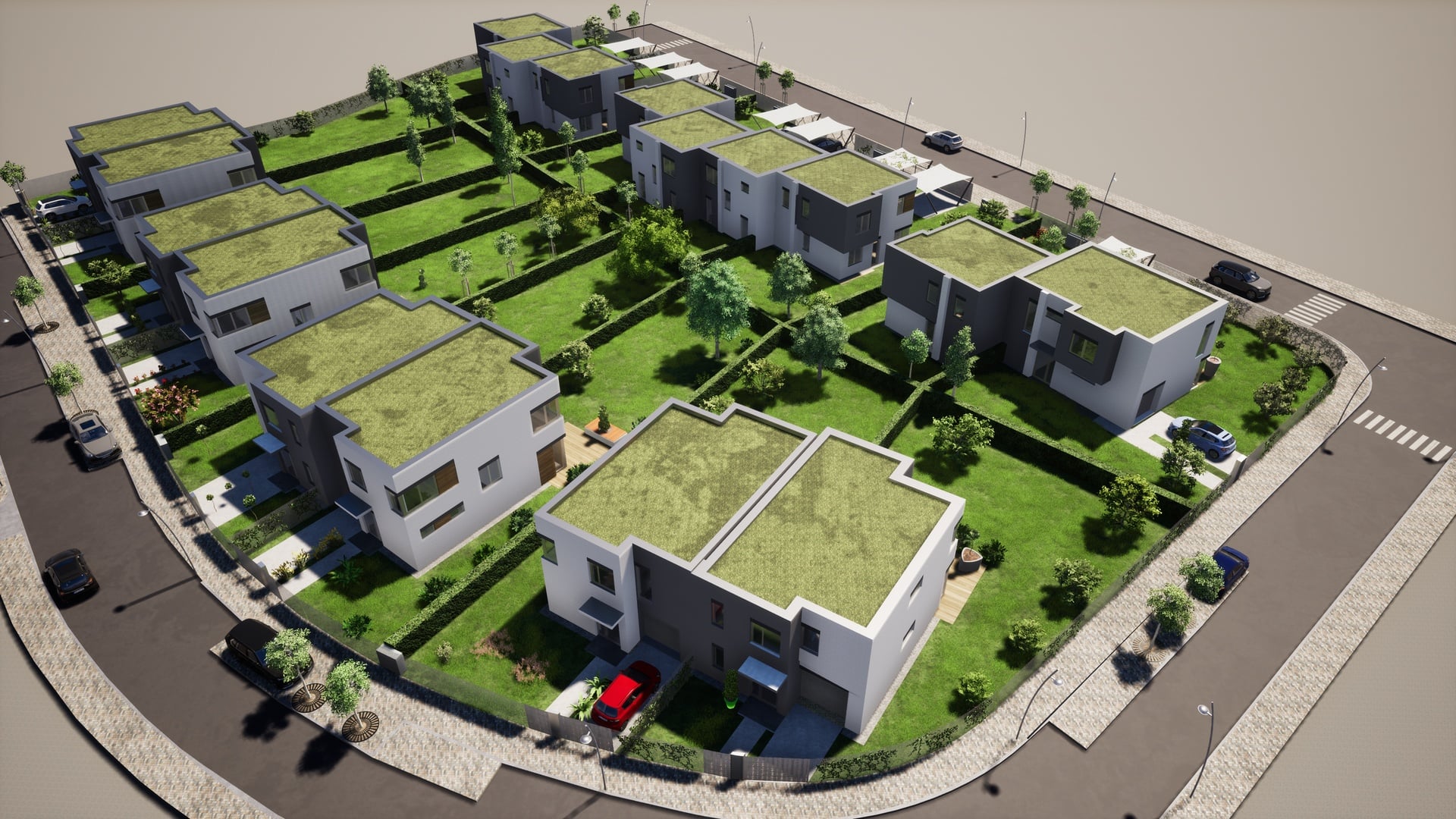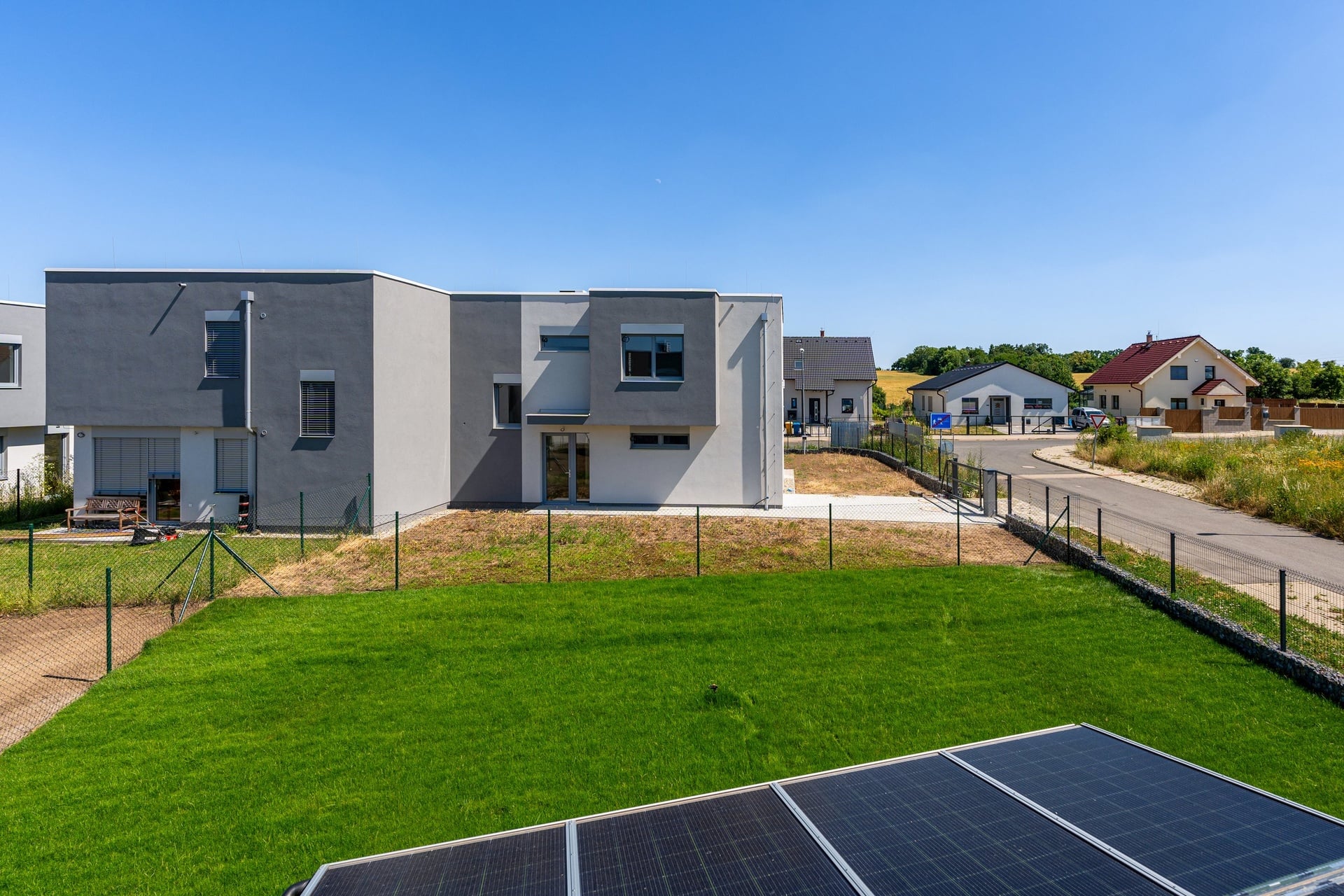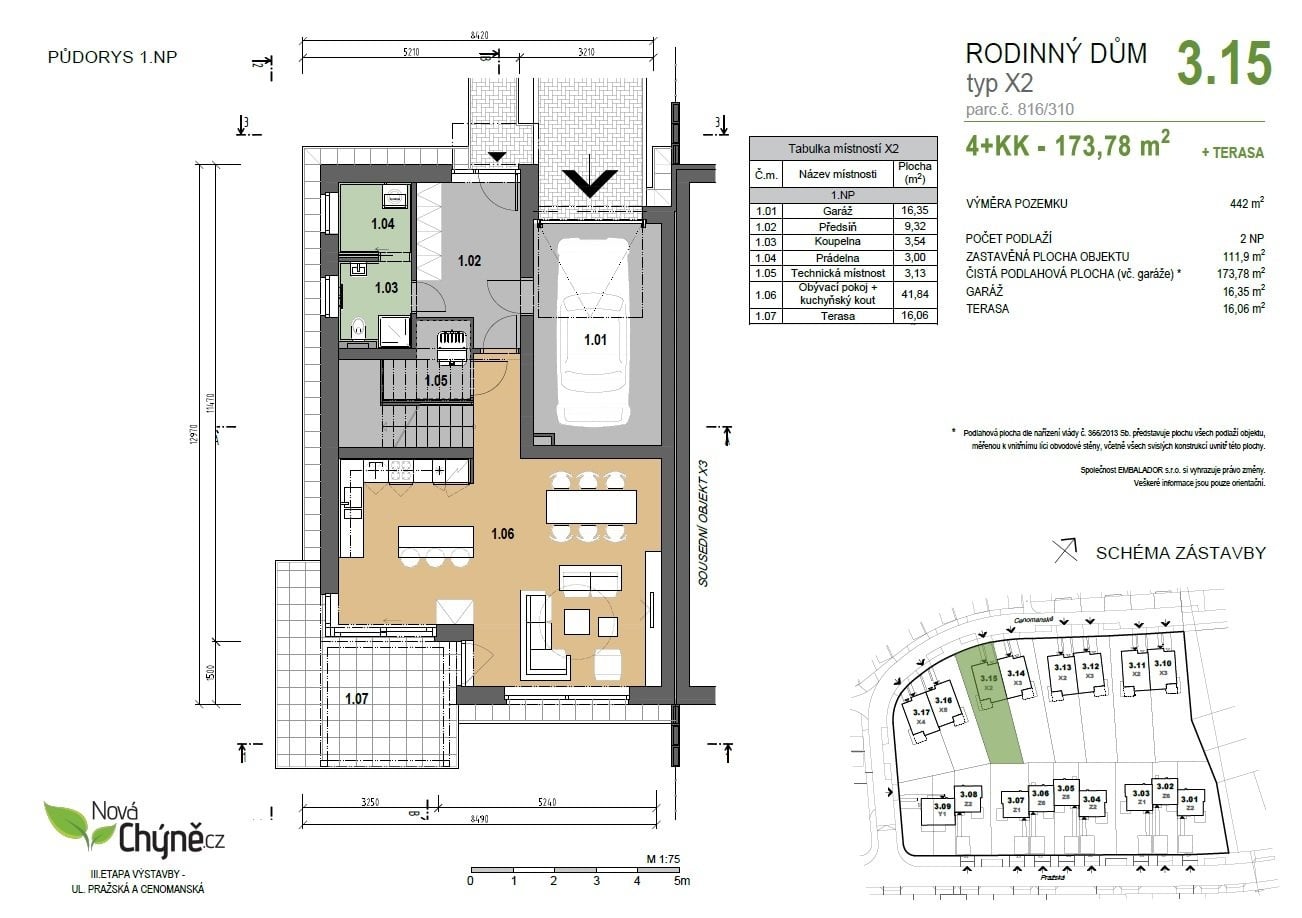 Nabízíme energeticky úsporný rodinný dům se zahradou v projektu NOVÁ CHYNĚ, na západním okraji Prahy – ve městě Chýně – s dojezdem 14 km do centra Prahy. Projekt uspokojí lokalitou, kvalitou zděných domů s praktickými dispozicemi a zahradami i technologickou promyšleností. Nabízený rodinný dům je zděný, má dispozici 4+kk+G, podlahovou plochu 173,8 m2, celkovou užitnou plochu 173,4 m2, z toho terasu 16 m2. Stojí na pozemku o rozloze 442 m2 se zahradou 330 m2. Součástí domu je garáž pro jeden vůz a jedno další park. stání je na vlastním pozemku.