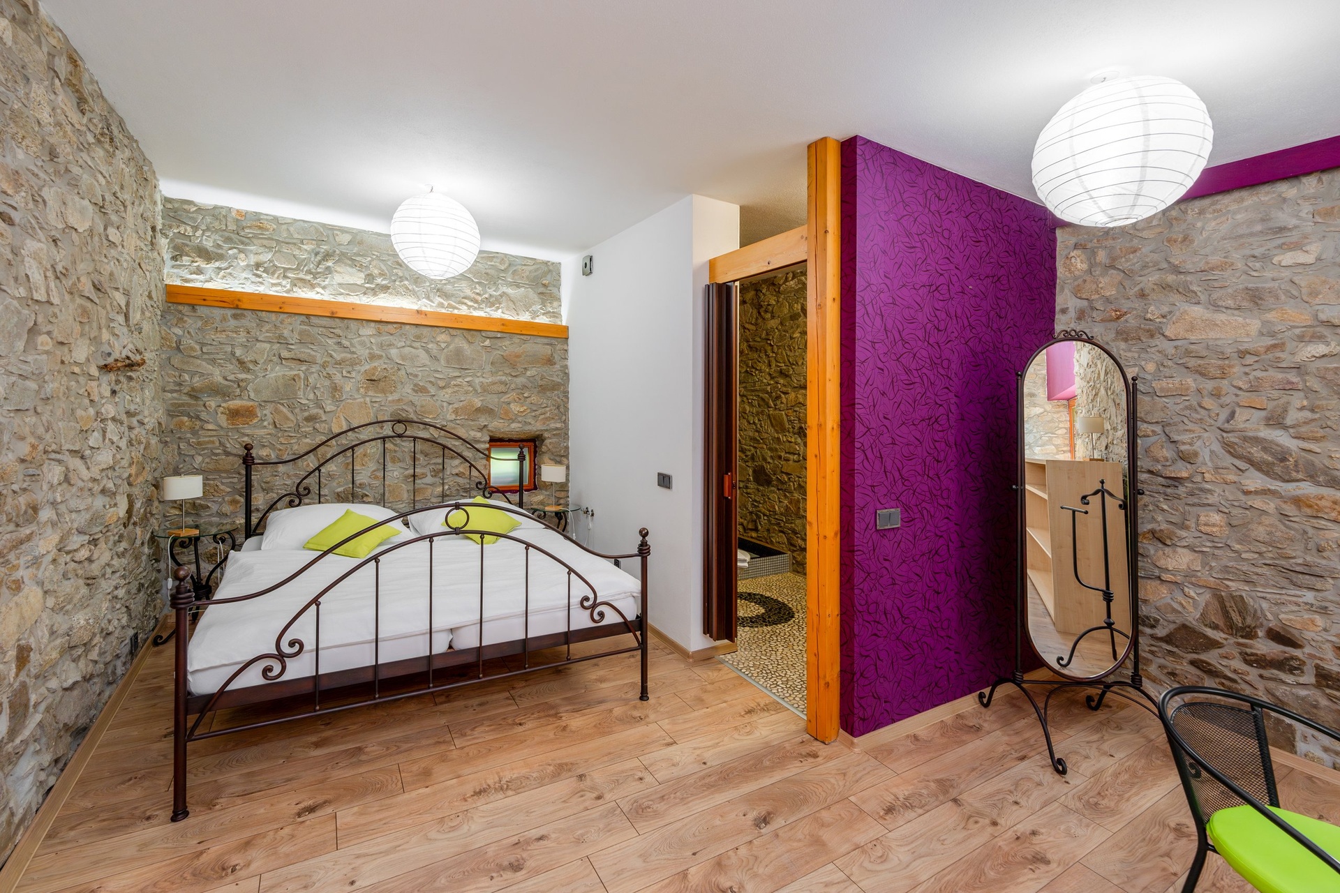 Dům má dvě samostatné části. Hlavní nabízí v 1. NP: prostorný obývací pokoj s možností krbu a 5 pokojů s koupelnami. Dále chodby a úložné a technické zázemí. V druhé části nemovitosti jsou nad sebou dvě designová studia s koupelnami, každé má své soukromí a lze doplnit o kuchyňku. Ve spodním studiu je navíc příprava pro wellness se saunou a stylová terasa (18 m²). Obě studia lze obývat či pronajímat samostatně a je možné je také propojit v jeden mezonetový byt s terasou. Nemovitost sloužila pro ubytování s restaurací a pro bydlení. Nový majitel může uzpůsobit interiér dle svých představ.