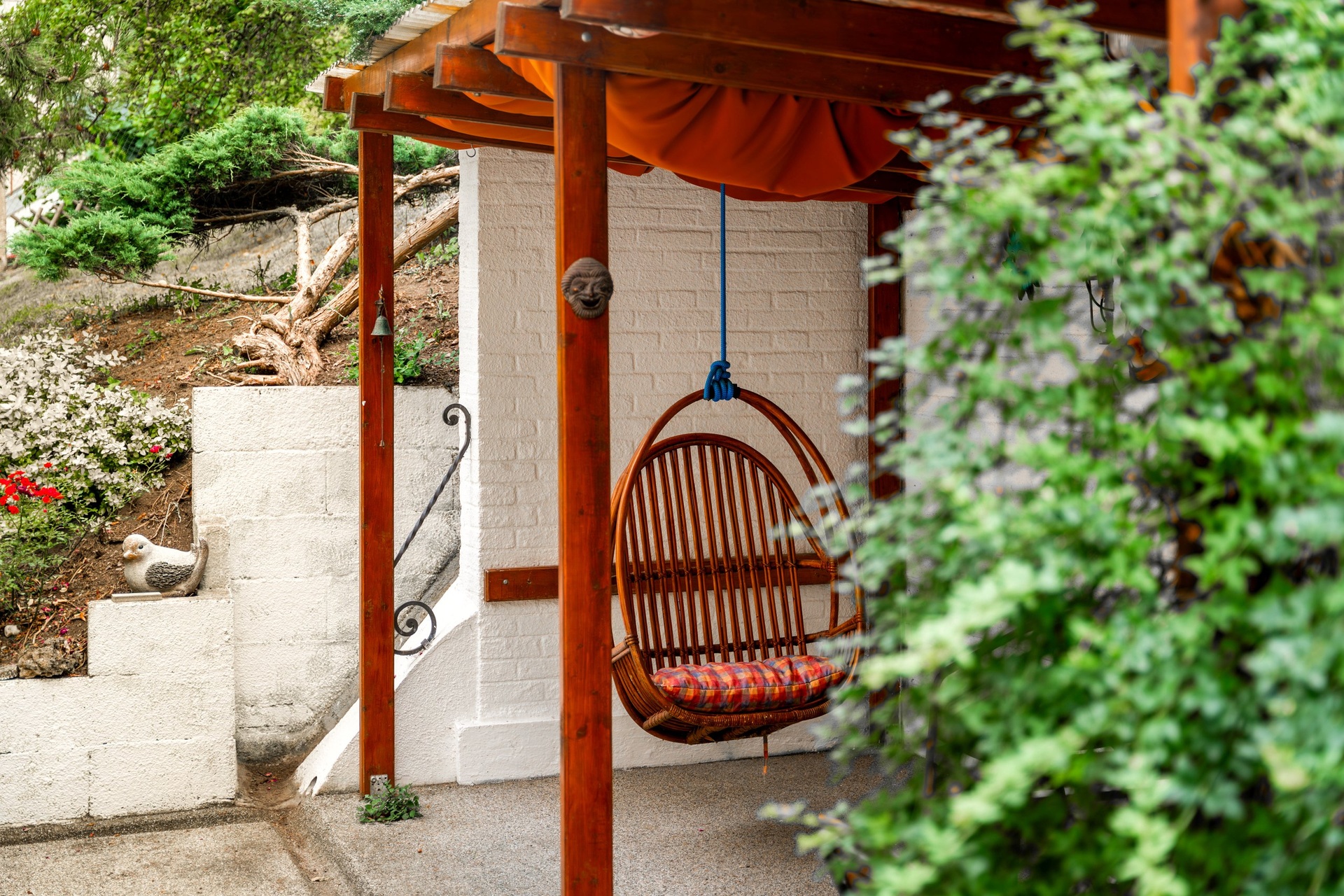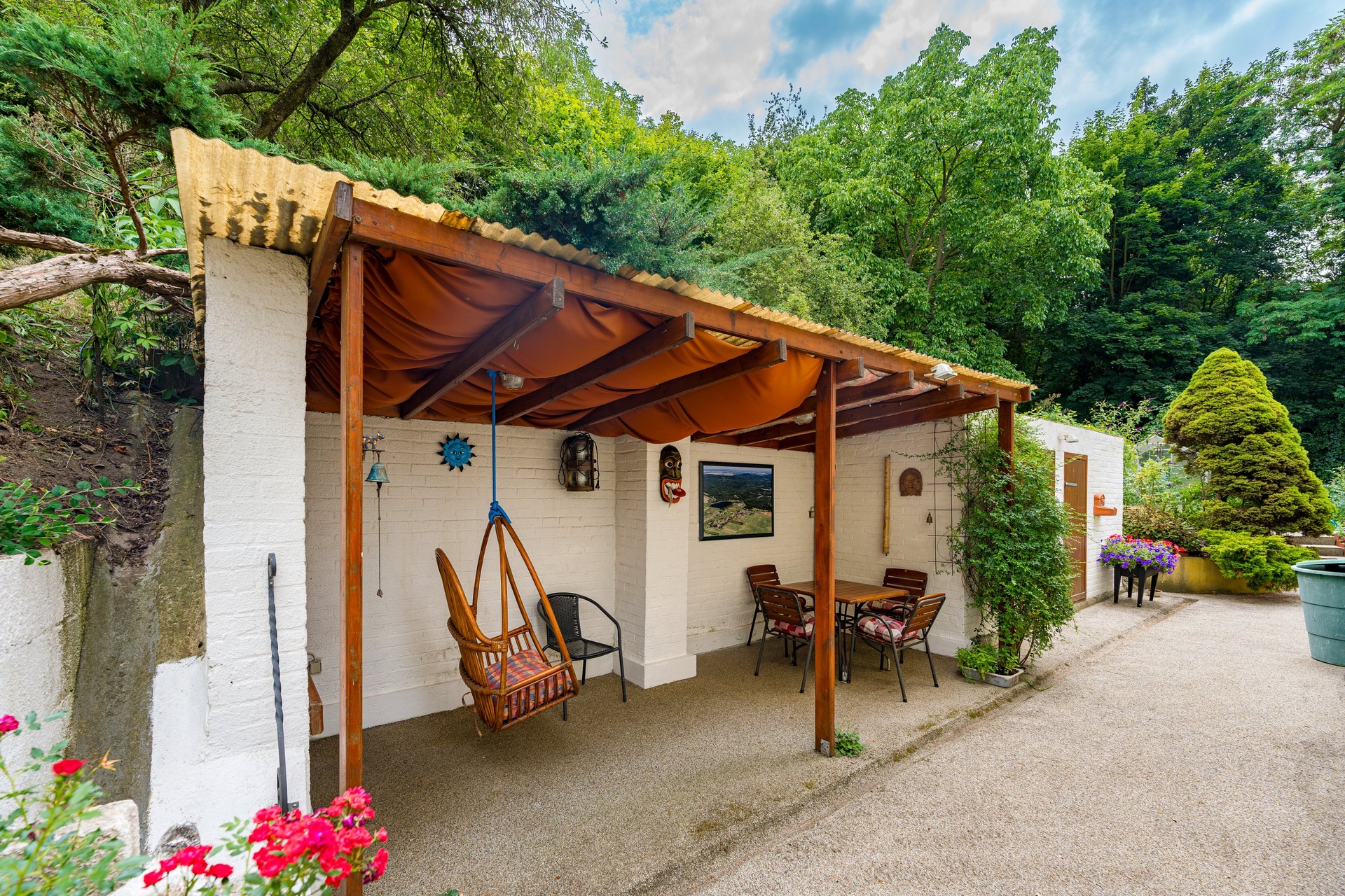 Zahrada je díky svažitému terénu členitě řešená a nabízí řadu příjemných zákoutí. Najdete zde pergolu s posezením, venkovní sklípek, úložný prostor na zahradní náčiní, a také prostor pro pěstování zeleniny, ovoce a květin.