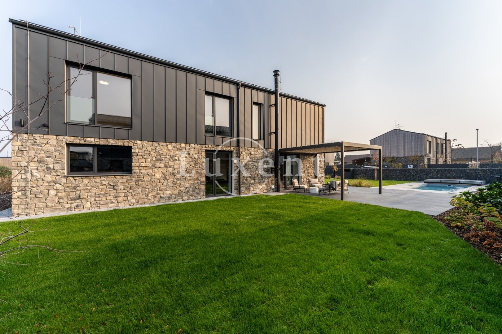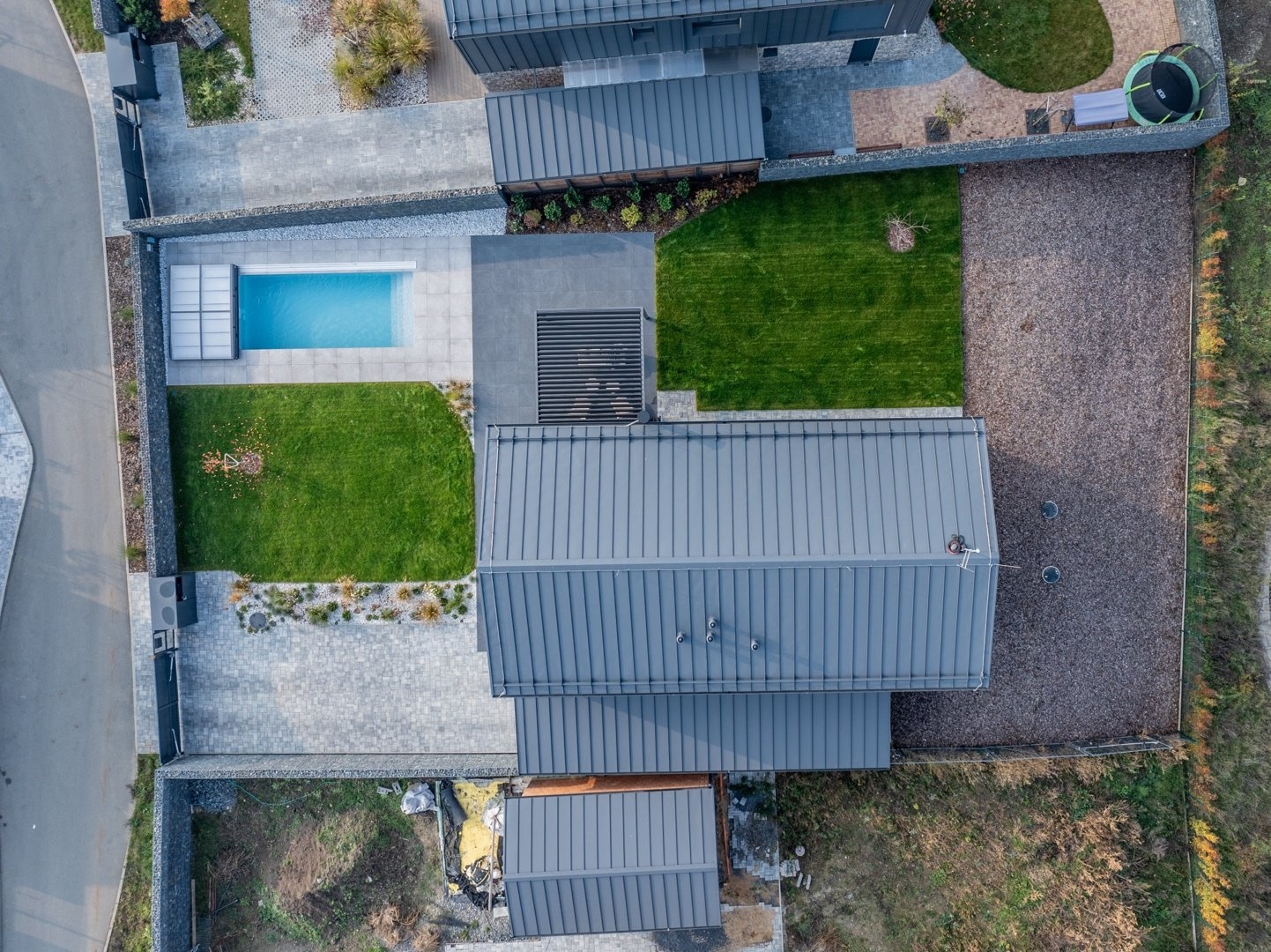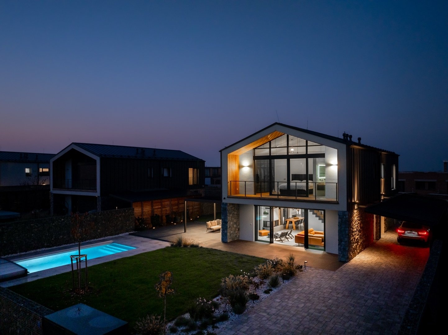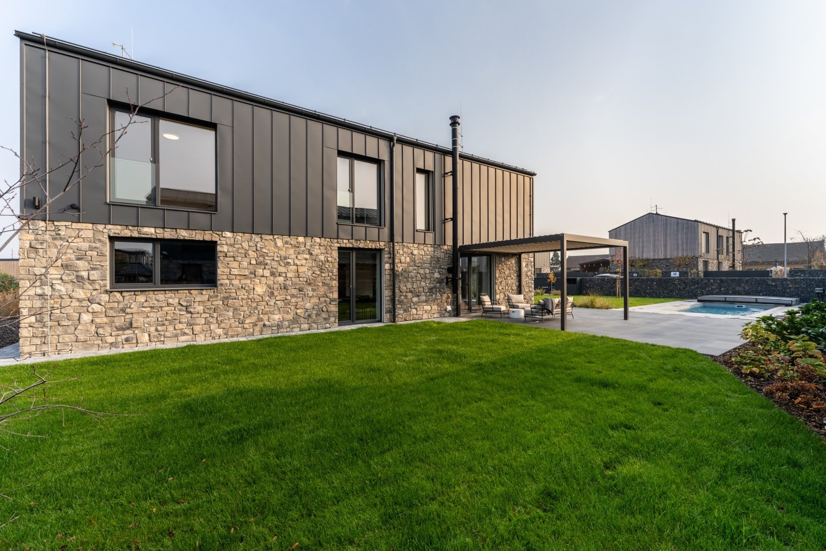 U domu je zastřešené stání pro dva vozy a další parkování pro tři vozy na pozemku. Zahrada je kompletně zrealizovaná, položený travní koberec, zasazené stromy a keře. U domu je bazén Desjoyaux 7x3 m s nejvyšší řadou zastřešení Alukov. Dům má kamenný obklad fasády v kombinaci 2.NP s oplechováním. Plášť tvoří cihlové bloky Porotherm (44 Profi), příčky cihlové Porotherm Wienerberger. Střecha Ruukki Classic – špičková ocelová střecha, jejíž profil připomíná tradiční falcované krytiny. Okna na čele domu v obou patrech jsou hliníková (HS portál), ostatní okna trojskla, kvalitní plastová v antracitu v tónu střechy a na všech oknech jsou předokenní hliníkové žaluzie ovládané LOXONE. Interiérové designové dveře s kouřovým sklem JAP a bezfalcové dveře od firmy Prüm, vstupní dveře hliníkové prosklené, antracit, trojsklo. Vytápění a chlazení domu tepelným čerpadlem Vaillant (země – voda) s integrovaným zásobníkem teplé užitkové vody. Podlahové topení a chlazení Rehau. V domě je příprava na FVE. Energetická třída domu je B – velmi úsporná. Na zahradě je retenční nádrž na dešťovou vodu.