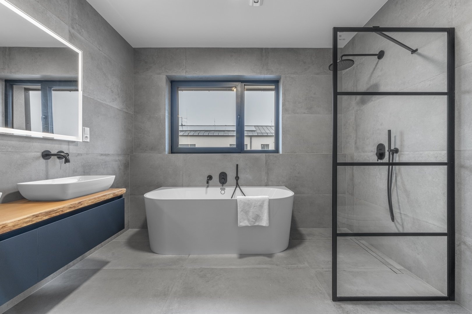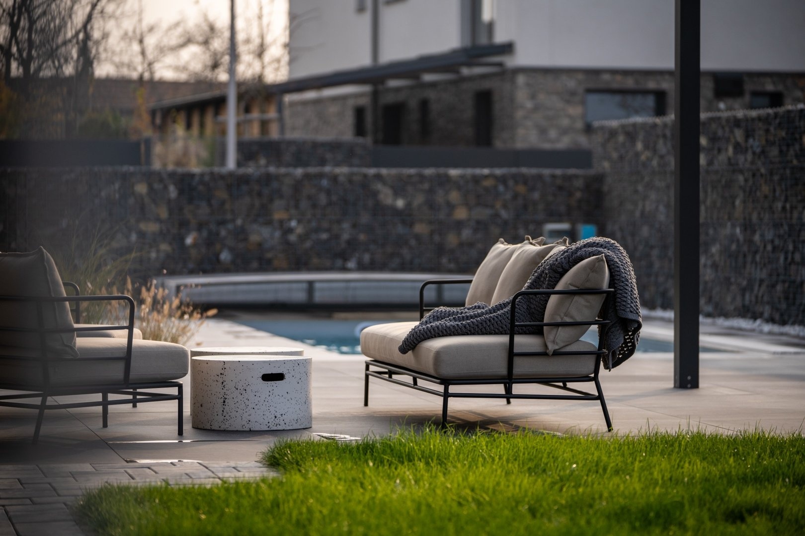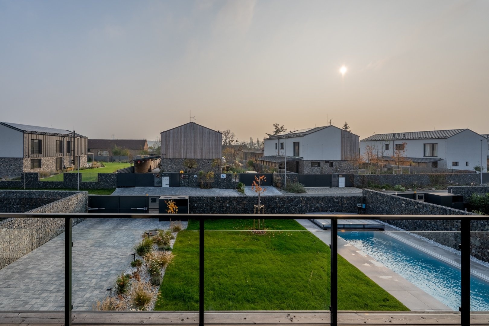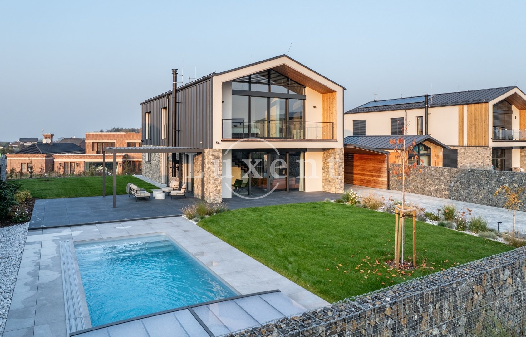 U domu je zastřešené stání pro dva vozy a další parkování pro tři vozy na pozemku. Zahrada je kompletně zrealizovaná, položený travní koberec, zasazené stromy a keře. U domu je bazén Desjoyaux 7x3 m s nejvyšší řadou zastřešení Alukov. Dům má kamenný obklad fasády v kombinaci 2.NP s oplechováním. Plášť tvoří cihlové bloky Porotherm (44 Profi), příčky cihlové Porotherm Wienerberger. Střecha Ruukki Classic – špičková ocelová střecha, jejíž profil připomíná tradiční falcované krytiny. Okna na čele domu v obou patrech jsou hliníková (HS portál), ostatní okna trojskla, kvalitní plastová v antracitu v tónu střechy a na všech oknech jsou předokenní hliníkové žaluzie ovládané LOXONE. Interiérové designové dveře s kouřovým sklem JAP a bezfalcové dveře od firmy Prüm, vstupní dveře hliníkové prosklené, antracit, trojsklo. Vytápění a chlazení domu tepelným čerpadlem Vaillant (země – voda) s integrovaným zásobníkem teplé užitkové vody. Podlahové topení a chlazení Rehau. V domě je příprava na FVE. Energetická třída domu je B – velmi úsporná. Na zahradě je retenční nádrž na dešťovou vodu.