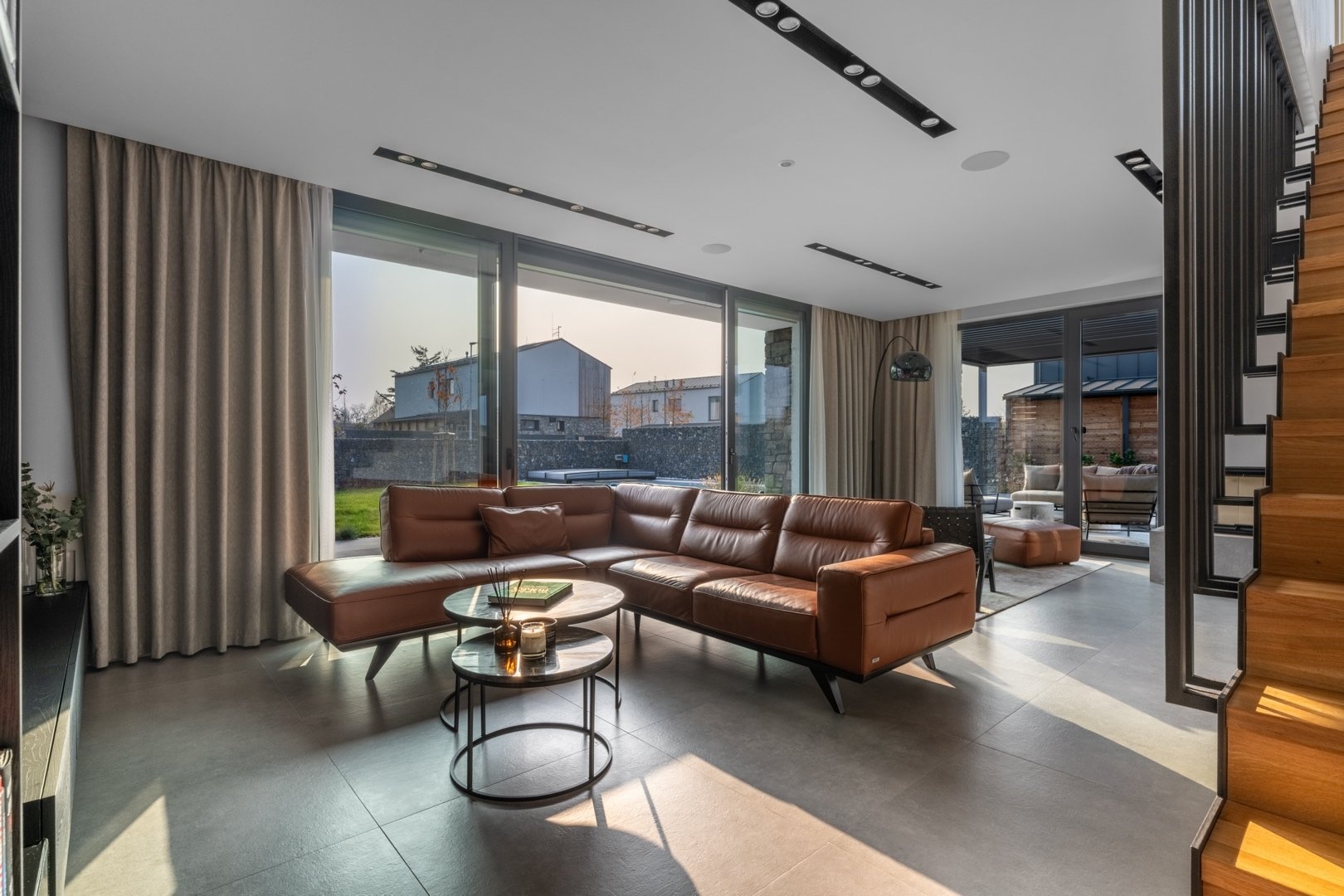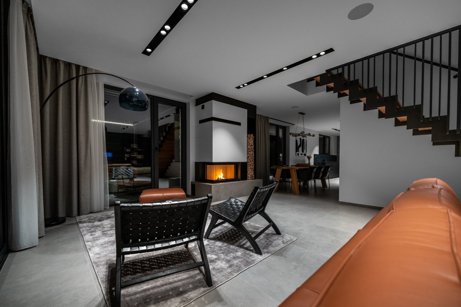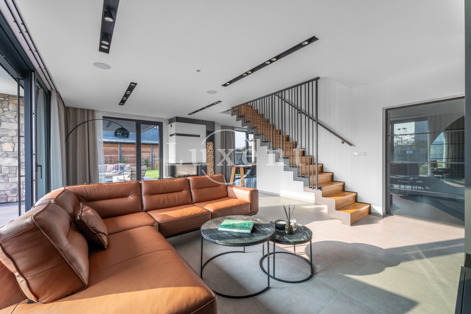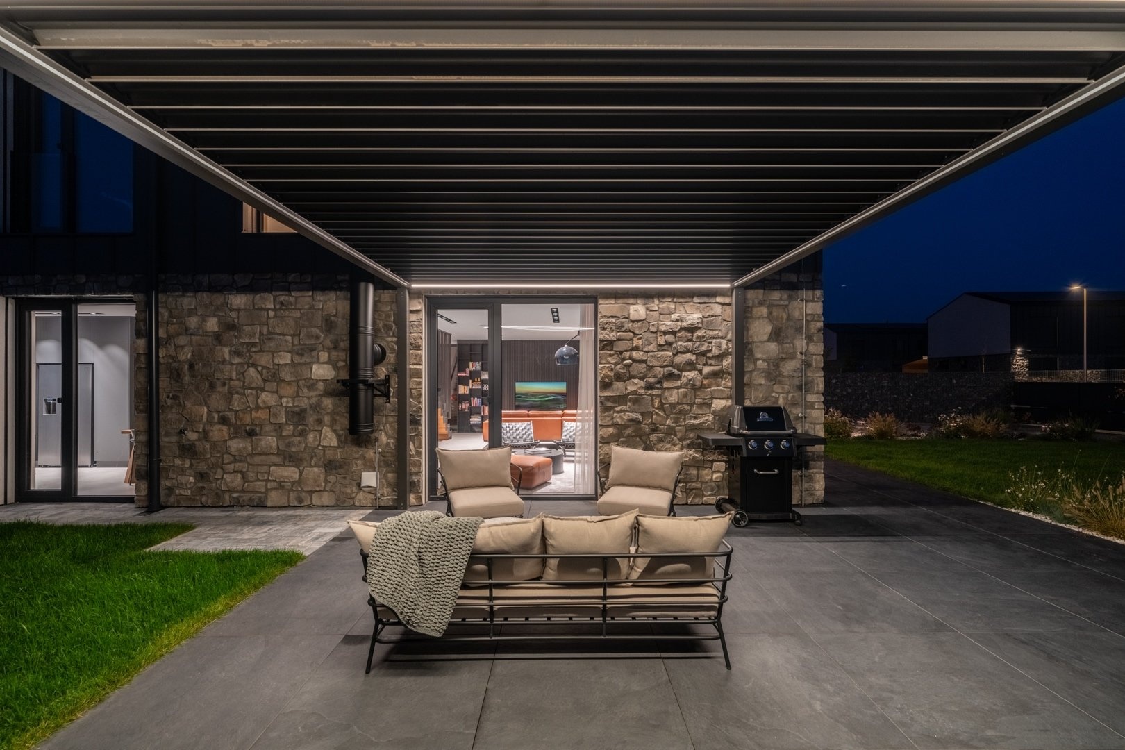V 1.NP je prostorná předsíň s vestavěnými šatními skříněmi, pokoj pro hosty (12 m²), koupelna se sprchovým koutem a toaletou, technická místnost a elegantní minimalistická kuchyň s jídelním koutem (27 m²), na kterou navazuje prosvětlený obývací pokoj s krbem ( 38,5 m²). Z obývacího pokoje je přístup na terasu, která má na západní části instalovanou bioklimatickou pergolu s LED osvětlením. Celé 1.NP má italskou velkoformátovou dlažbu 90x90cm.